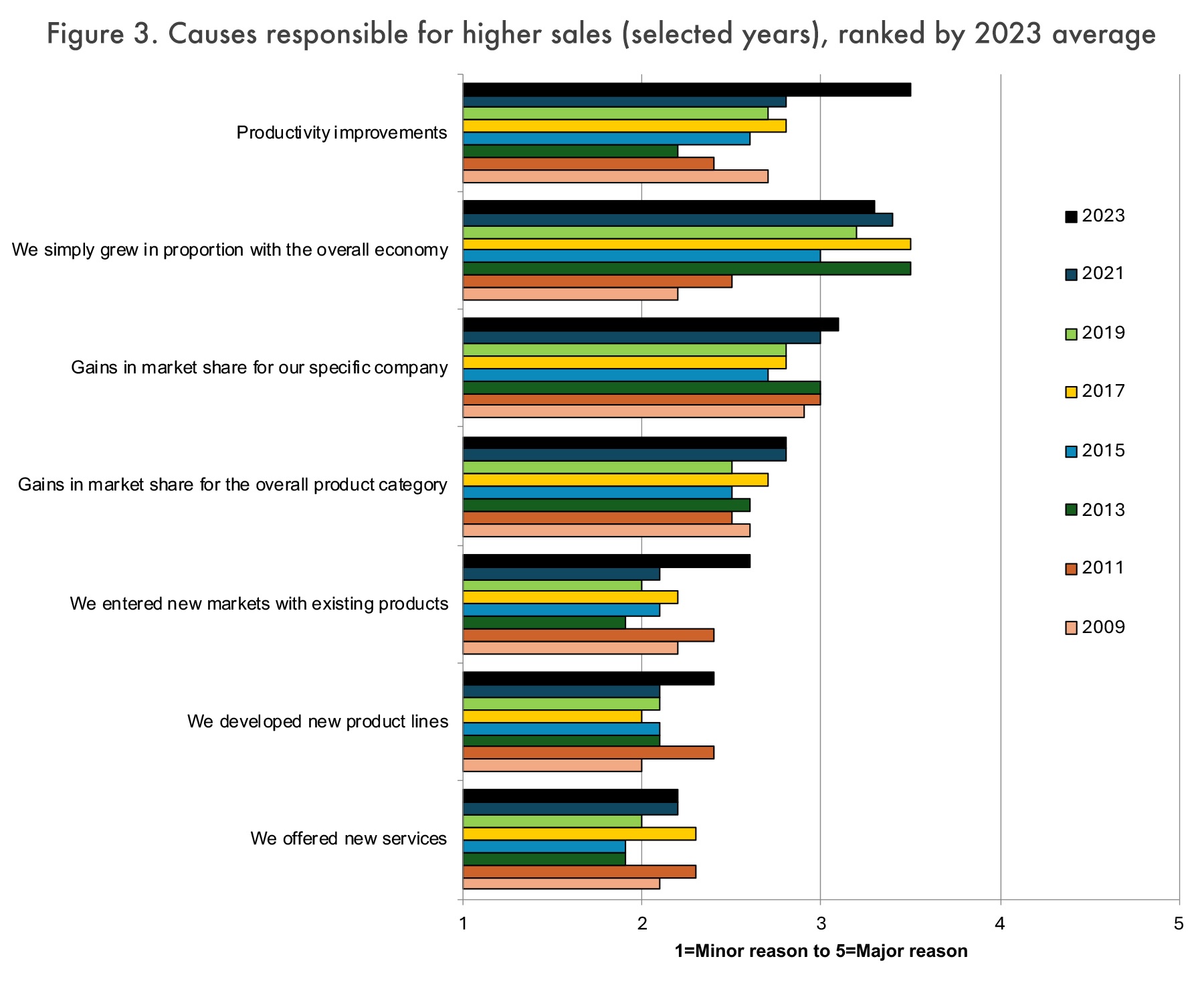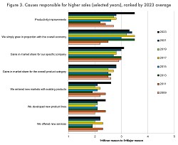 Рост в пропорции с общей экономикой также был оценен довольно высоко. Как воспринимаемая причина увеличения объема продаж, общая экономика постоянно оценивалась выше, чем деятельность отдельных фирм, например, разработка новых продуктов или новых услуг.