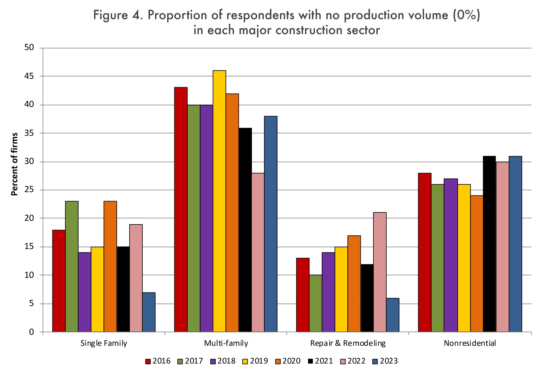 На вопрос о том, с чем связана большая часть (61%-100%) объема их производства, 37% респондентов назвали строительство односемейных домов, за которыми следуют реконструкция (30%), нежилые дома (10%) и многосемейные дома (7%). Это подчеркивает относительную важность строительства односемейных домов, ремонта и реконструкции для вторичной деревообрабатывающей промышленности. И, как показано на рисунке 4 , только 7% и 6% респондентов не вели бизнес на рынках односемейных домов и ремонта и реконструкции соответственно в 2023 году. Это, вероятно, частично объясняет снижение объема продаж для многих фирм в 2023 году, учитывая слабость на этих рынках.