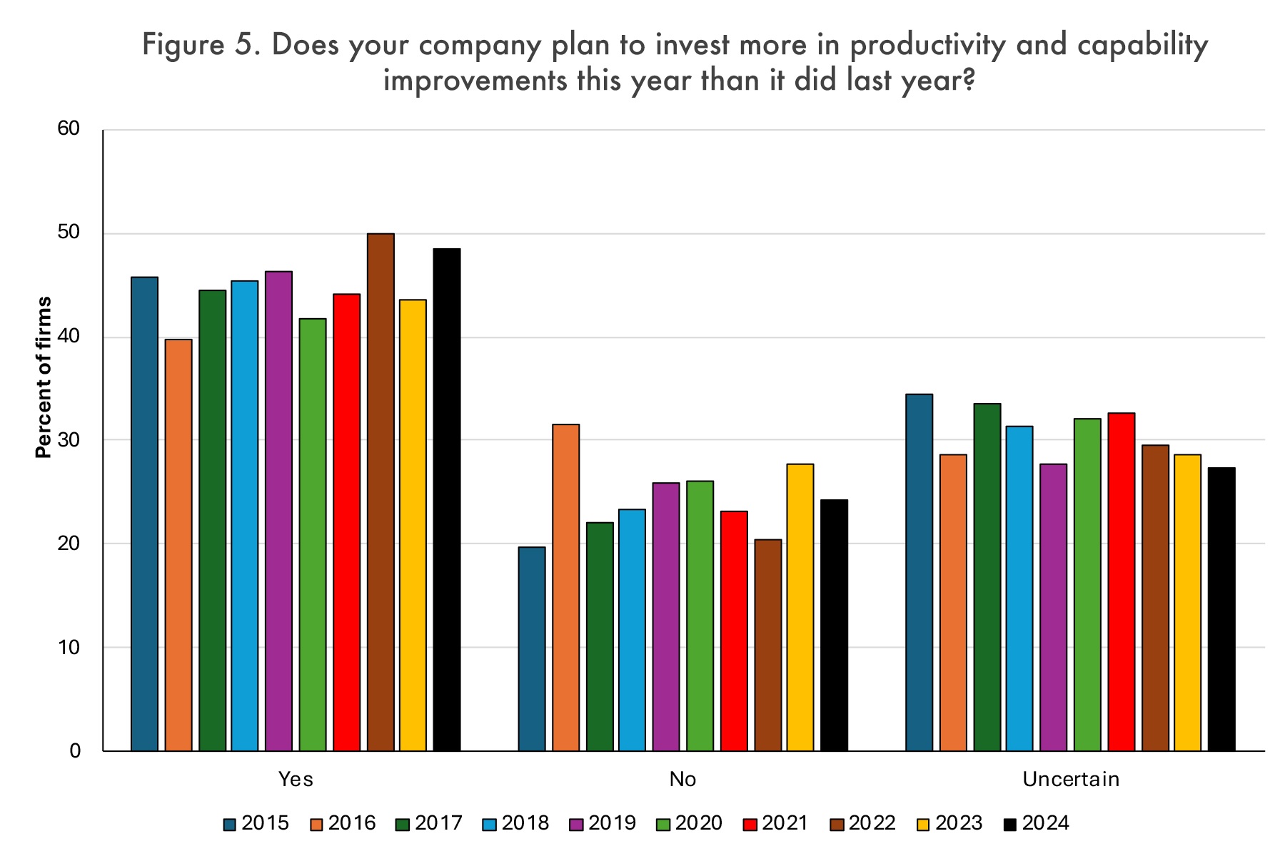 Как и в предыдущие годы, чуть менее половины (49%) планировали потратить больше на инвестиции в производительность и улучшение возможностей в 2024 году, чем в 2023 году, тогда как 24% планировали потратить меньше. Еще 27% не определились (Рисунок 5).