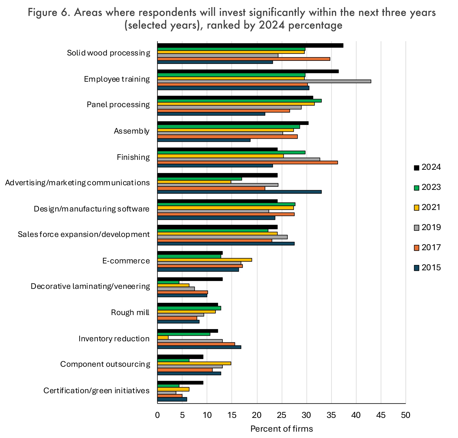Исследование также оценило общие категории или области, в которые запланированы инвестиции на ближайшие три года (Рисунок 6). Как и в последние годы, несколько инвестиций в производство остаются в верхней части списка. Кроме того, обучение сотрудников по-прежнему остается критической потребностью для производственных фирм. В исследовании этого года наивысшие баллы получили обработка массива древесины (37%), обучение сотрудников (36%) и обработка панелей (31%), за которыми следует сборка (30%).