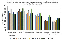 Несмотря на то, что 42% респондентов потеряли объем продаж, еще 45% сообщили об увеличении объема продаж, а 13% остались неизменными. Эти респонденты приписали свой успех в первую очередь повышению производительности, которая достигла наивысшего показателя в 2023 году (Рисунок 3). Это может означать, что компании смогли увеличить объемы производства и продать возросшую продукцию или что технологии использовались для компенсации напряженности на рынках труда.