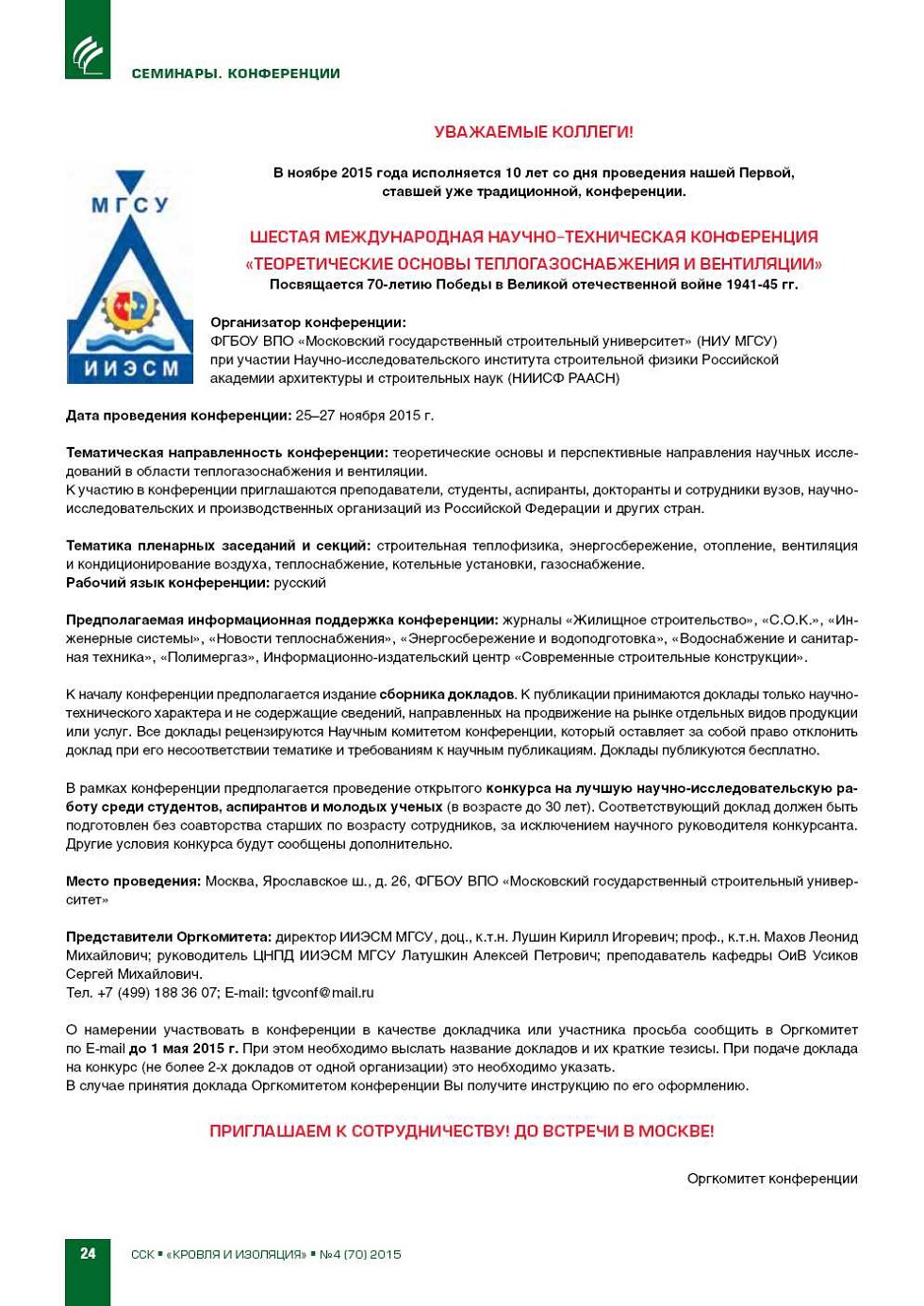 | Шестая международная научно.техническая конференция «Теоретические основы теплогазоснабжения и вентиляции» | ...24 |