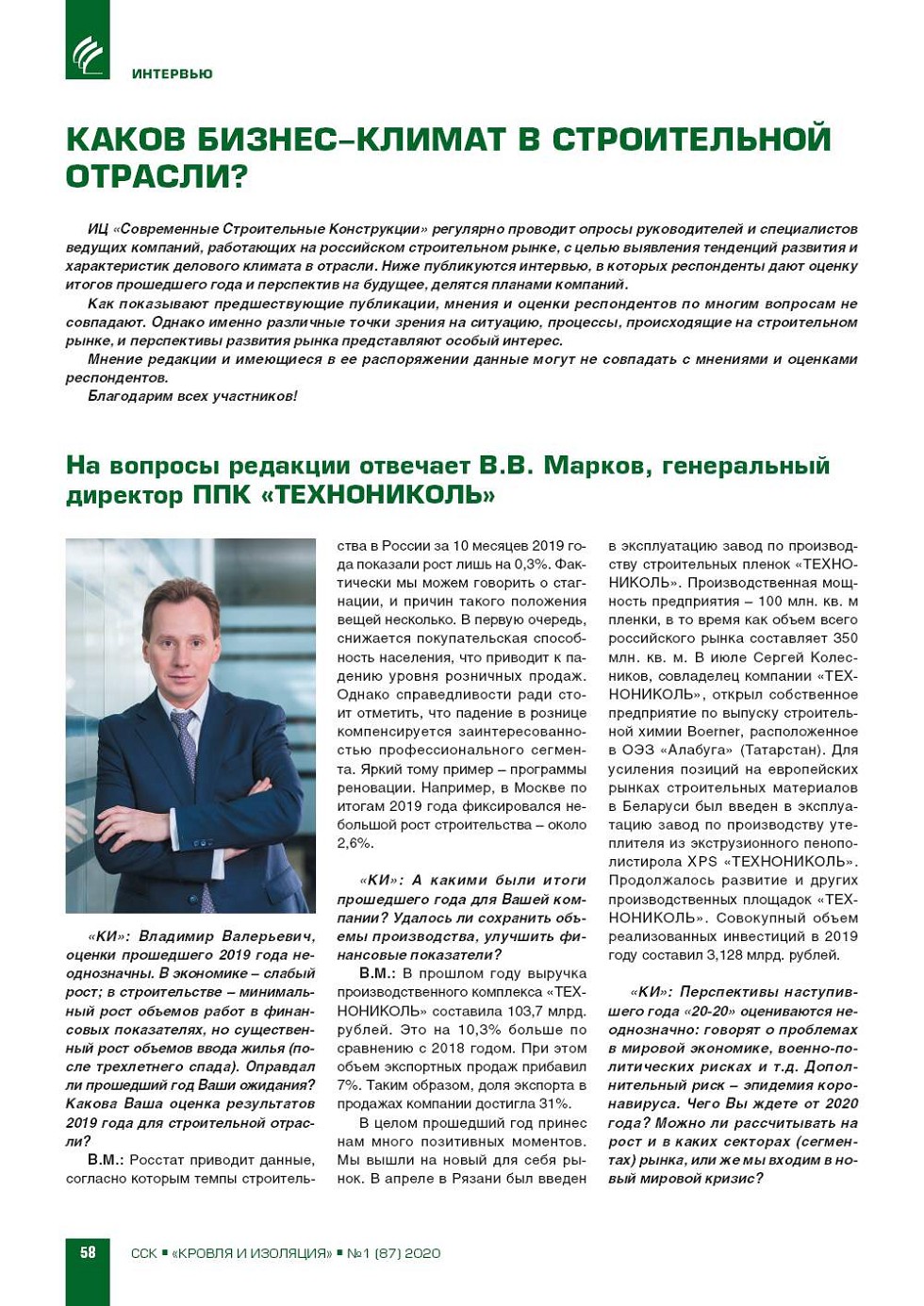 Каков бизнес-климат в строительной отрасли? На вопросы редакции отвечает В. В. Марков, генеральный директор ППК «ТЕХНОНИКОЛЬ»