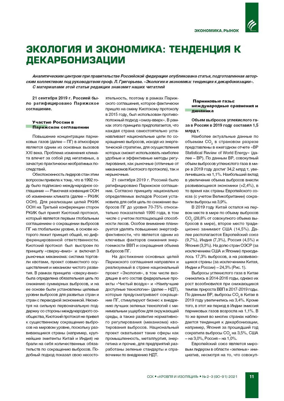 Аналитическим центром при правительстве Российской федерации опубликована статья, подготовленная авторским коллективом под руководством проф. Л. Григорьева. «Экология и экономика: тенденция к декарбонизации». С материалами этой статьи редакция знакомит... |