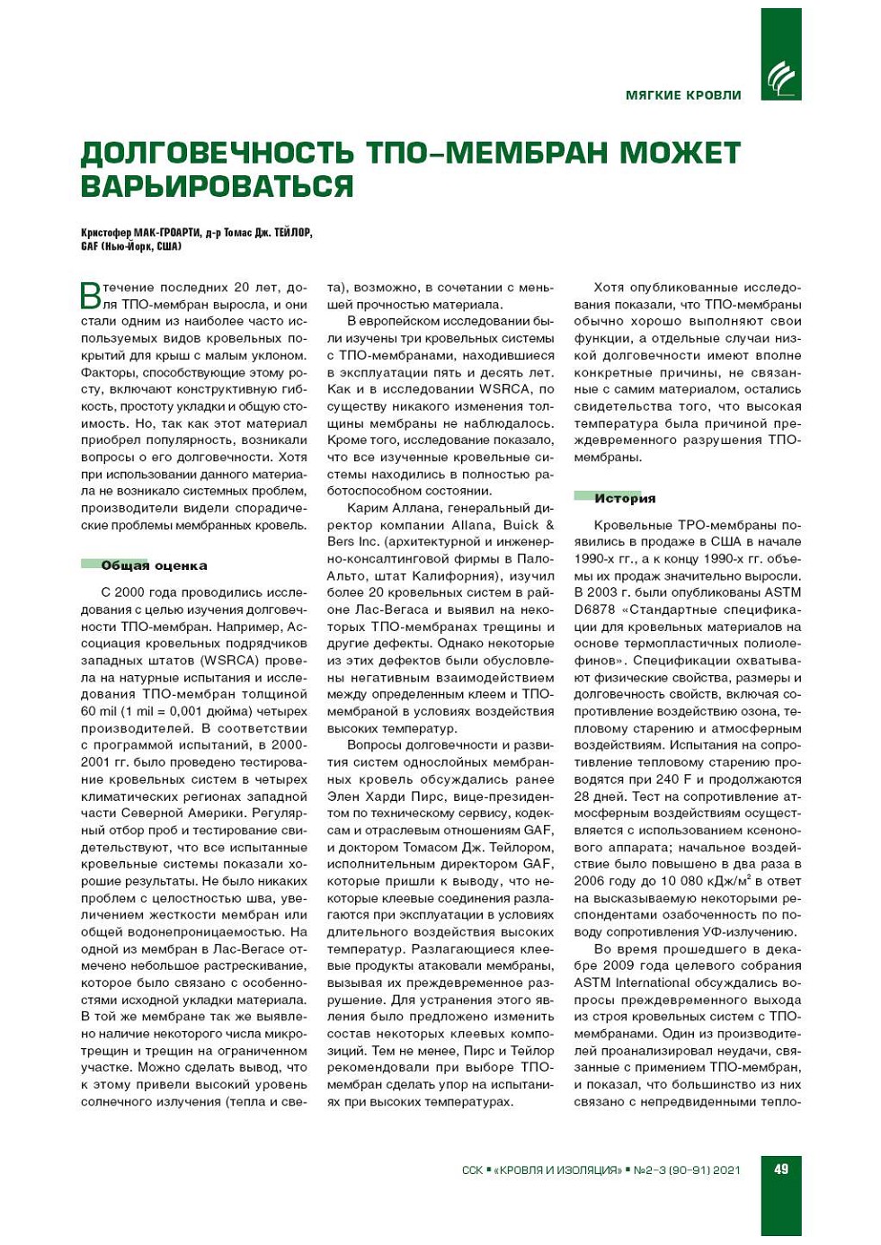 К.М.Гроарти, Т.Д.Тейлор ( GAF, Нью-Йорк, США). Долговечность ТПО-мембран