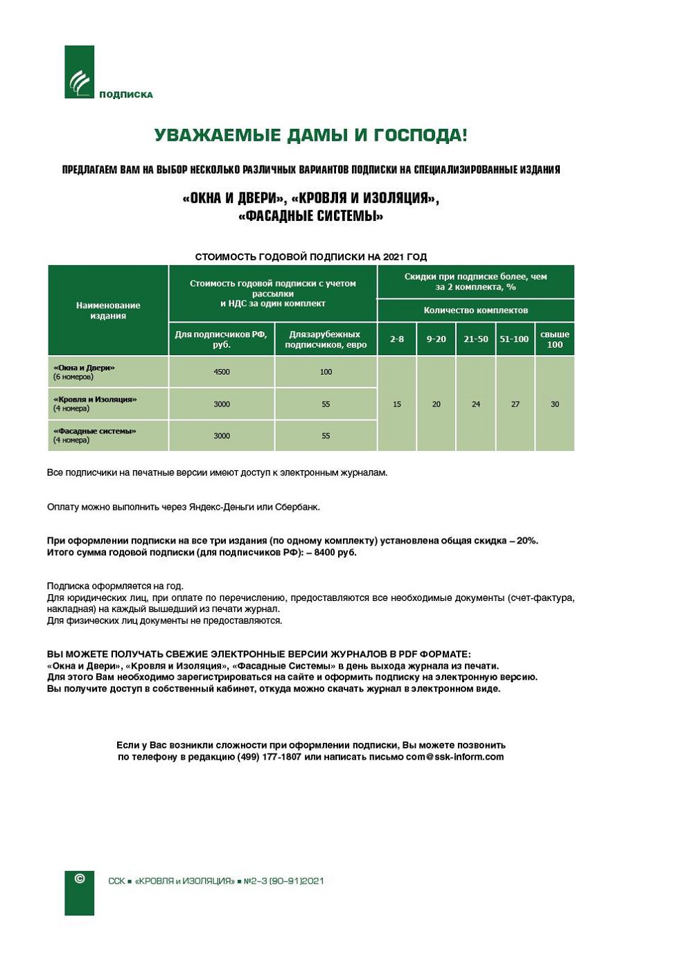 ПРЕДЛАГАЕМ ВАМ НА ВЫБОР НЕСКОЛЬКО РАЗЛИЧНЫХ ВАРИАНТОВ ПОДПИСКИ НА СПЕЦИАЛИЗИРОВАННЫЕ ИЗДАНИЯ «ОКНА И ДВЕРИ», «КРОВЛЯ И ИЗОЛЯЦИЯ», «ФАСАДНЫЕ СИСТЕМЫ» |