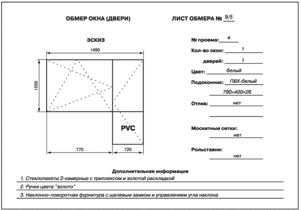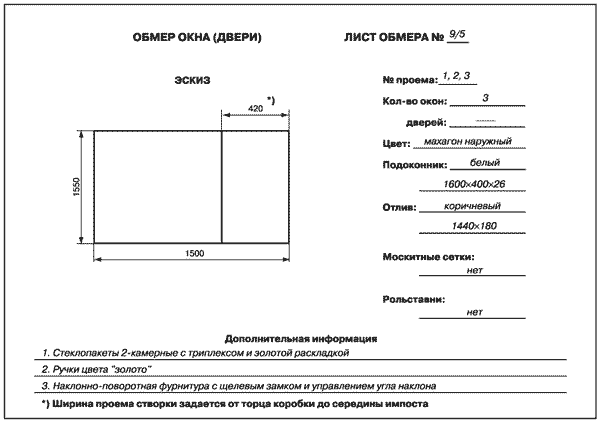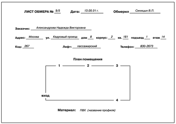 «Лист обмера» содержит всю информацию, необходимую для технологического расчета, доставки и установки окон. Образец заполнения приведен ниже.