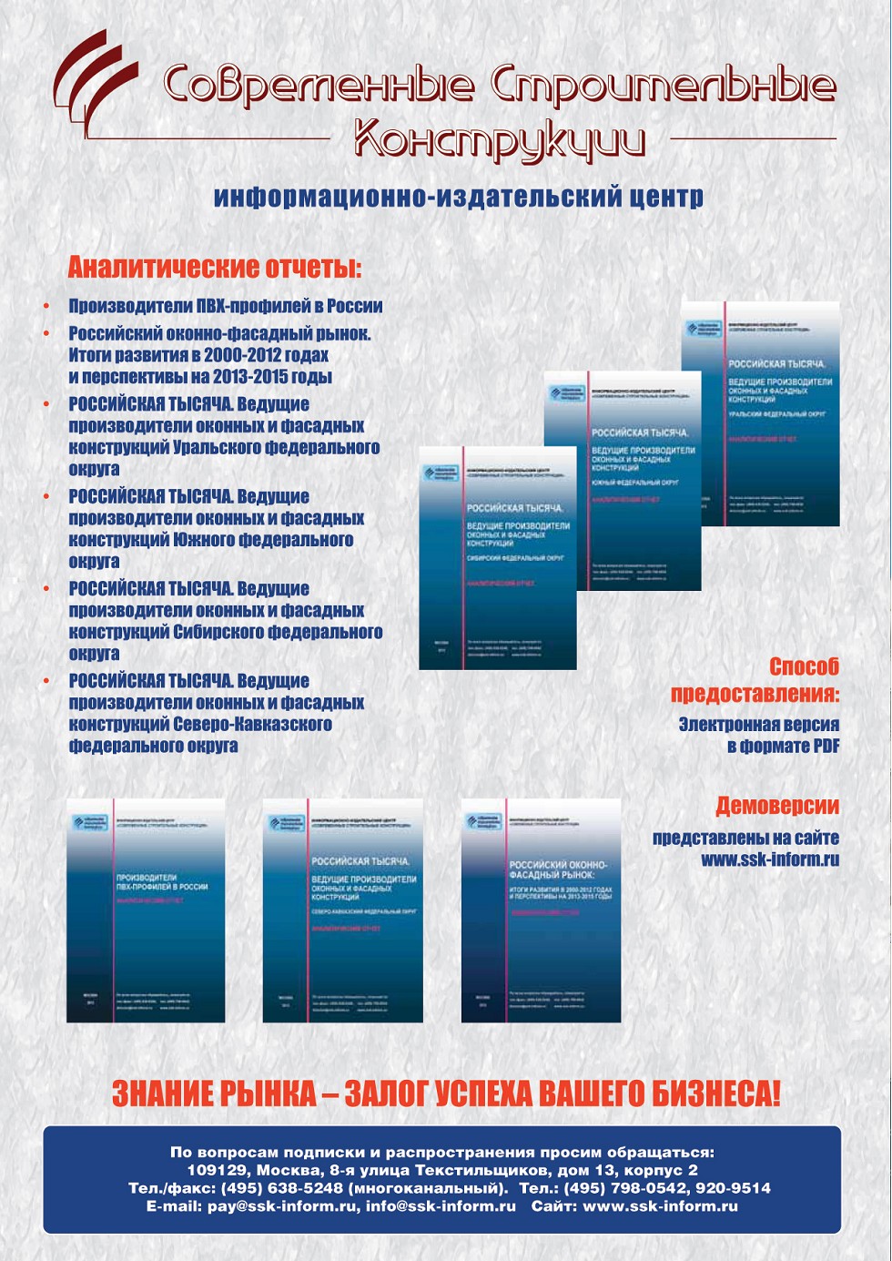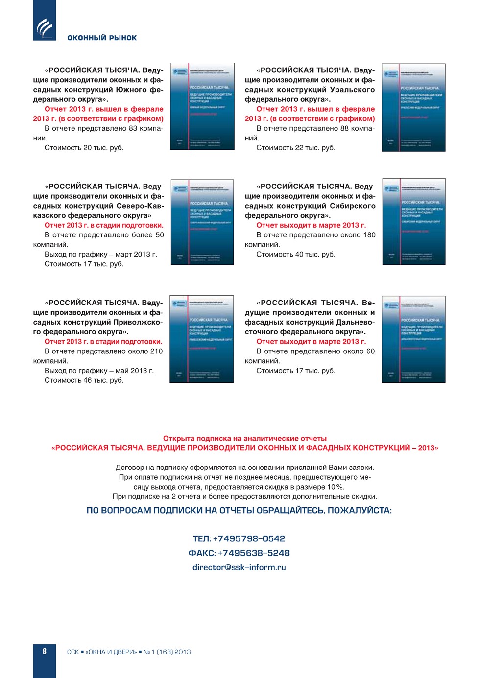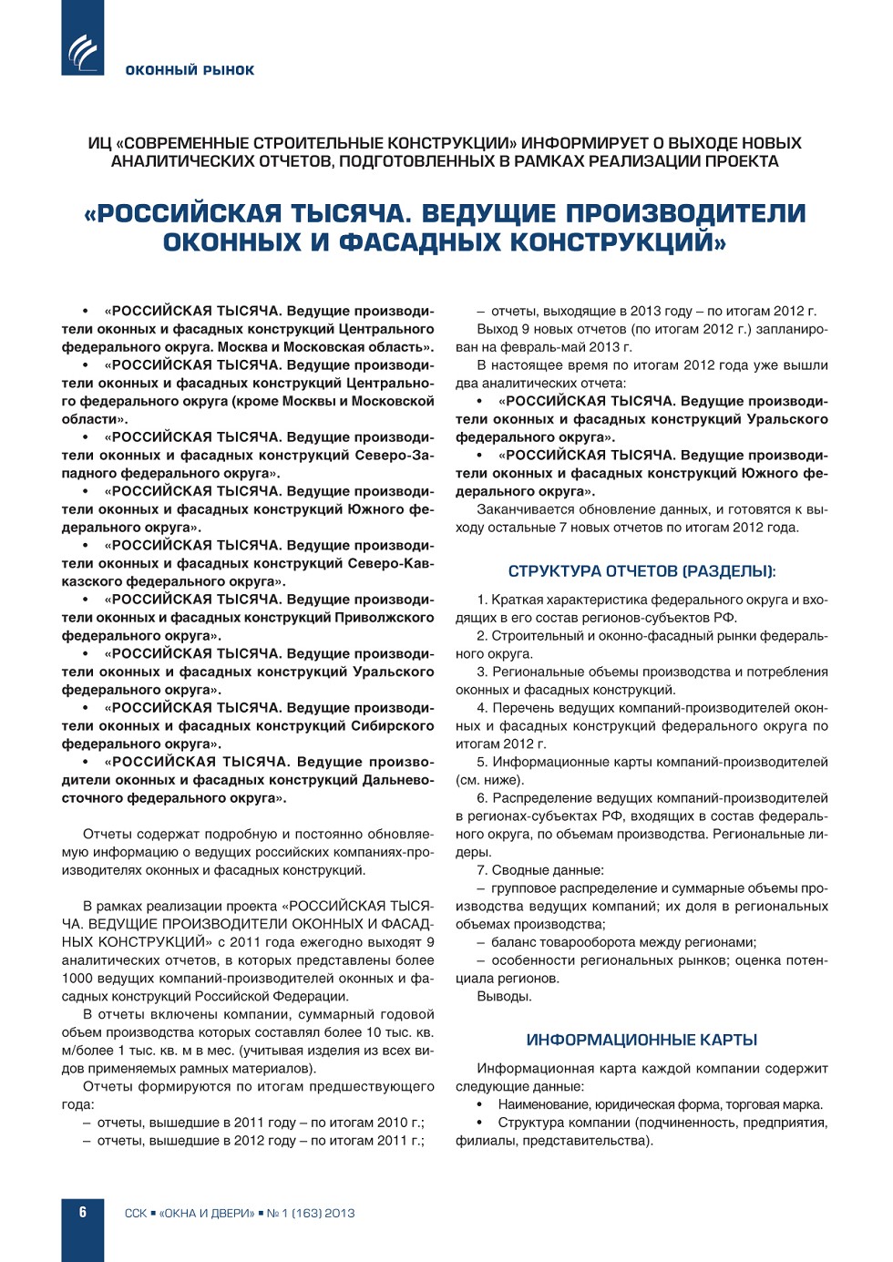 | ИЦ «ССК» информирует о выходе новых аналитических отчетов, подготовленных в рамках реализации проекта «РОССИЙСКАЯ ТЫСЯЧА. Ведущие производители оконных и фасадных конструкций» | ...6 |