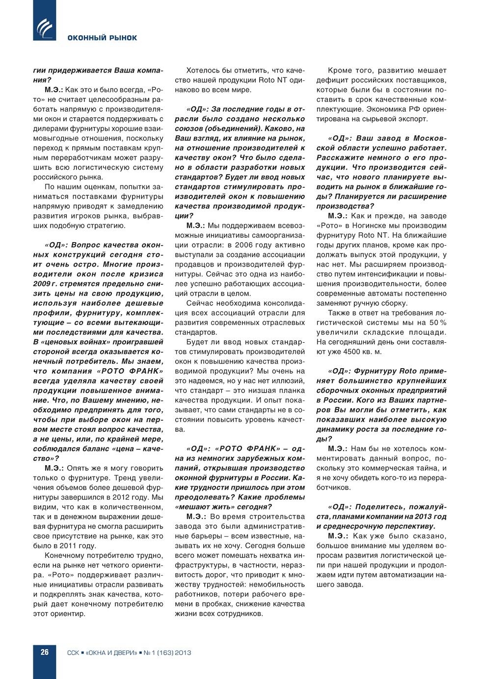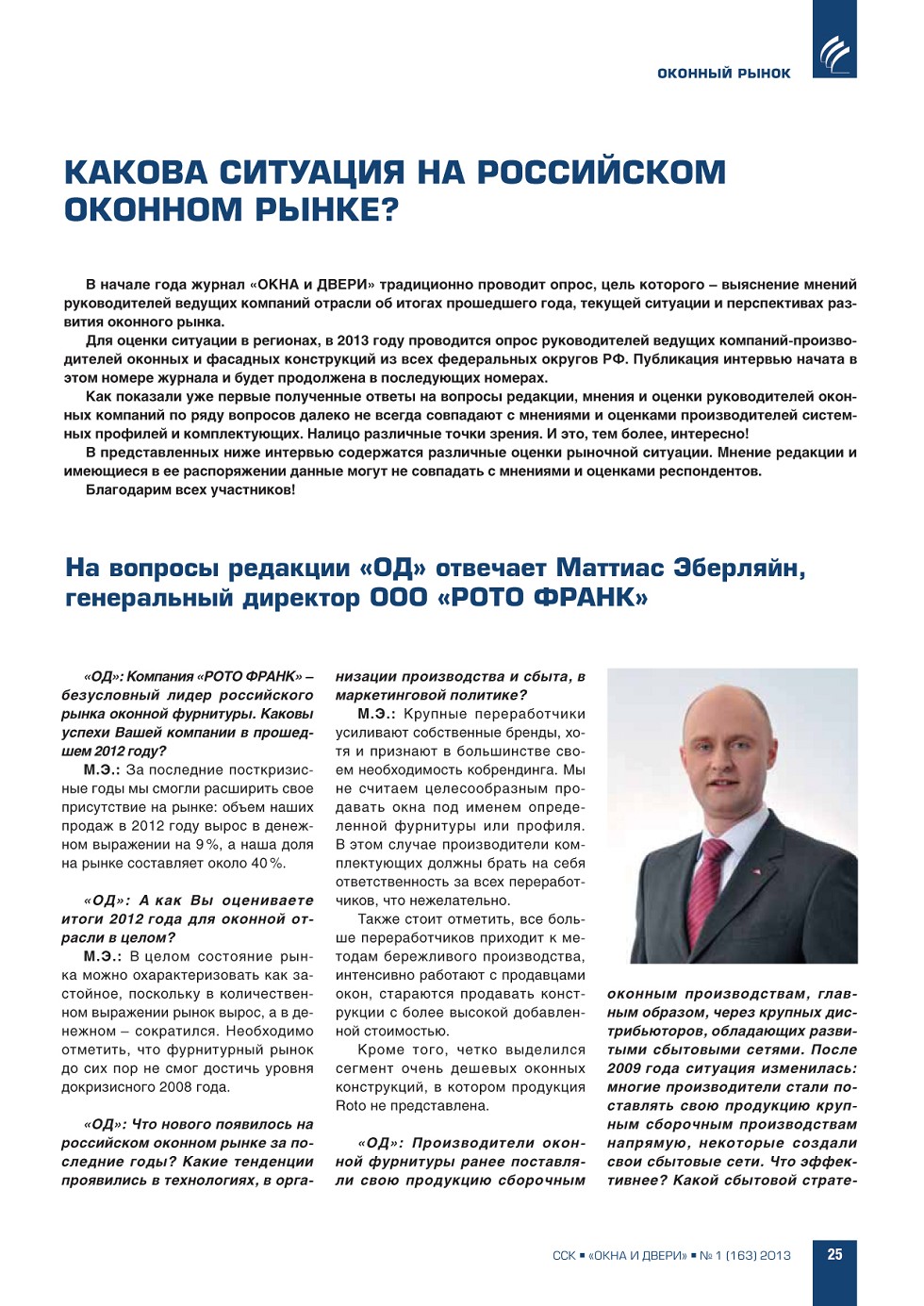 | Какова ситуация на российском оконном рынке? На вопросы редакции отвечают: М. Эберляйн, генеральный директор ООО «Рото Франк» | ...25 |