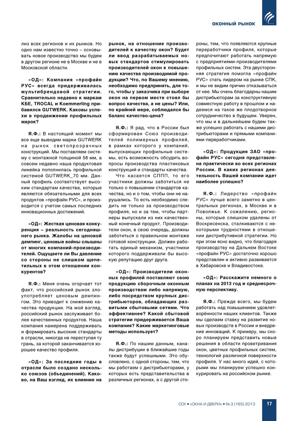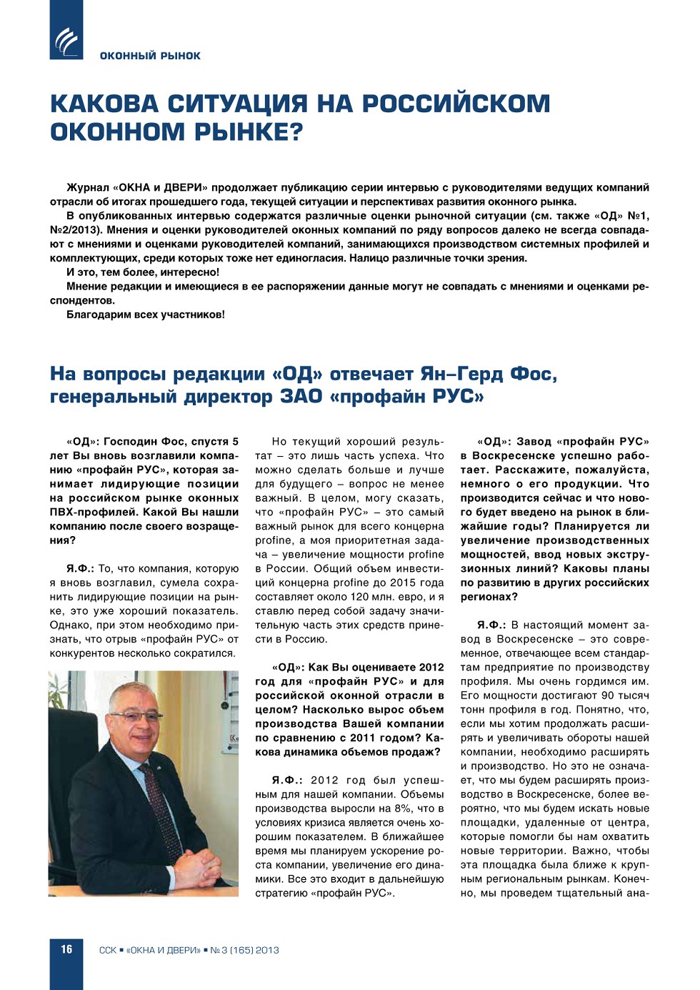 | Какова ситуация на российском оконном рынке? На вопросы редакции отвечает Ян-Герд Фос, генеральный директор ЗАО «профайн РУС» | ...16 |