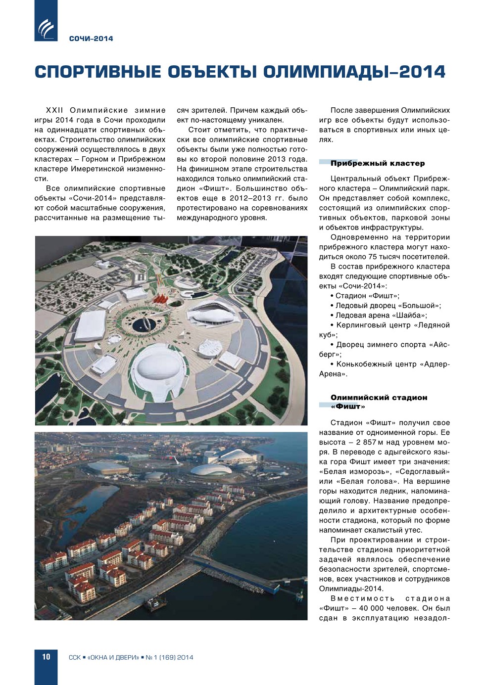 ХХII Олимпийские зимние игры 2014 года в Сочи проходили на одиннадцати спортивных объектах. Строительство олимпийских сооружений осуществлялось в двух кластерах – Горном и Прибрежном кластере Имеретинской низменно- сти. |