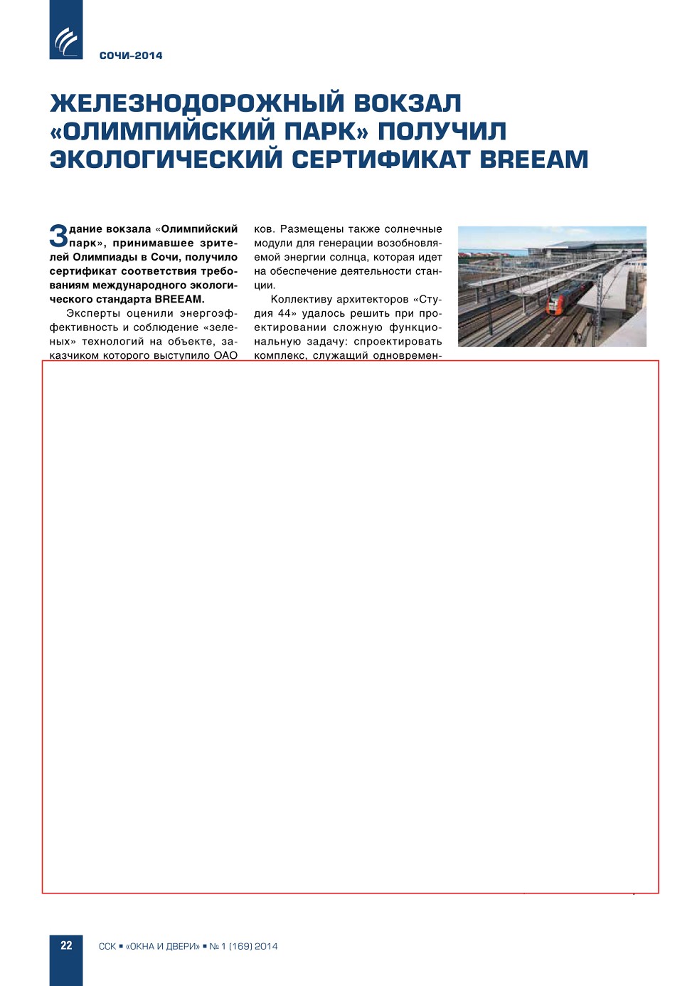 Здание вокзала «Олимпийский парк», принимавшее зрителей Олимпиады в Сочи, получило сертификат соответствия требованиям международного экологического стандарта BREEAM. |