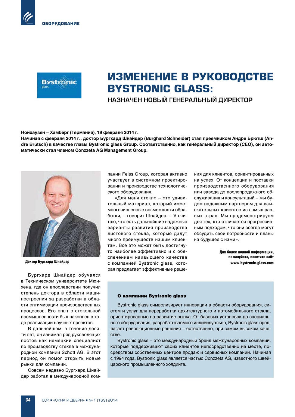 Нойхаузен – Хамберг (Германия), 19 февраля 2014 г. Начиная с февраля 2014 г., доктор Бургхард Шнайдер (Burghard Schneider) стал преемником Андре Брютш (Andre Brütsch) в качестве главы Bystronic glass Group. Соответственно, как генеральный директор... |