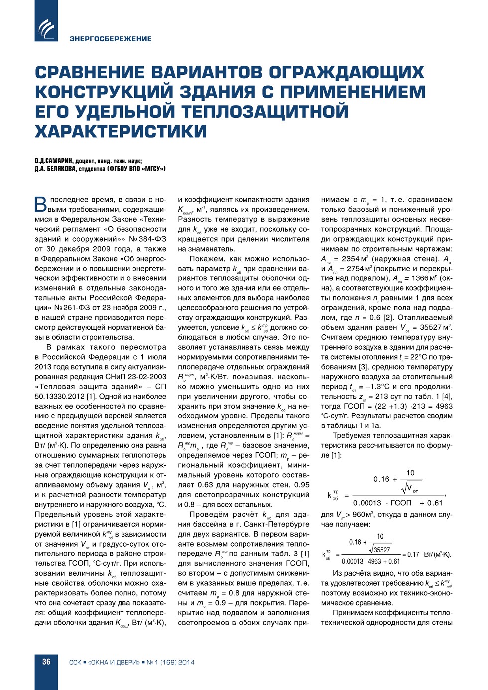 О Д Самарин, Белякова Д А (ФГБОУ ВПО «МГСУ») Сравнение вариантов ограждающих конструкций здания с применением его удельной теплозащитной характеристики