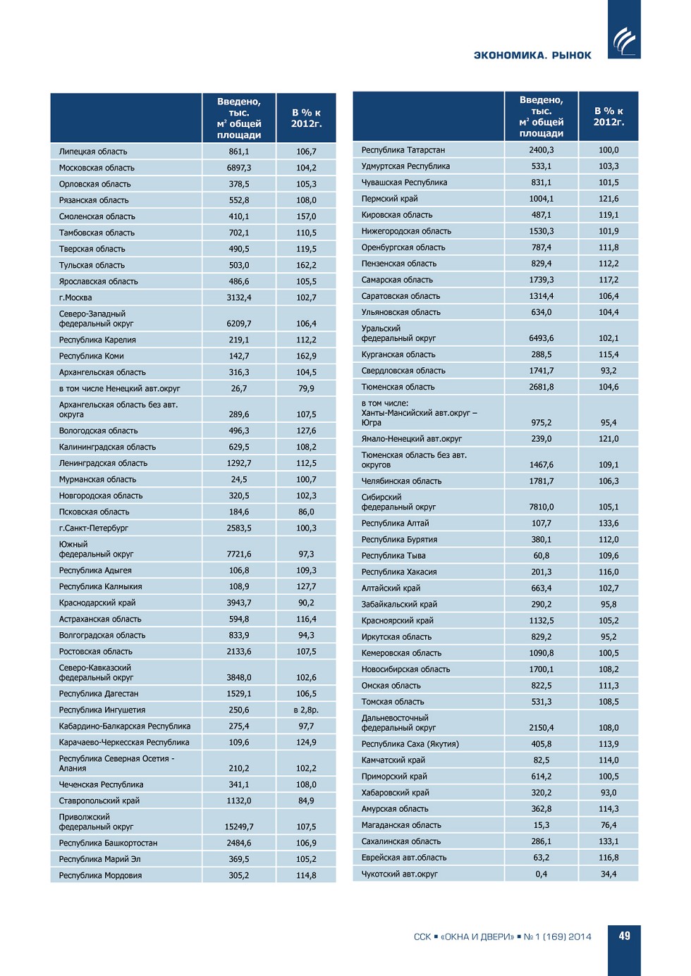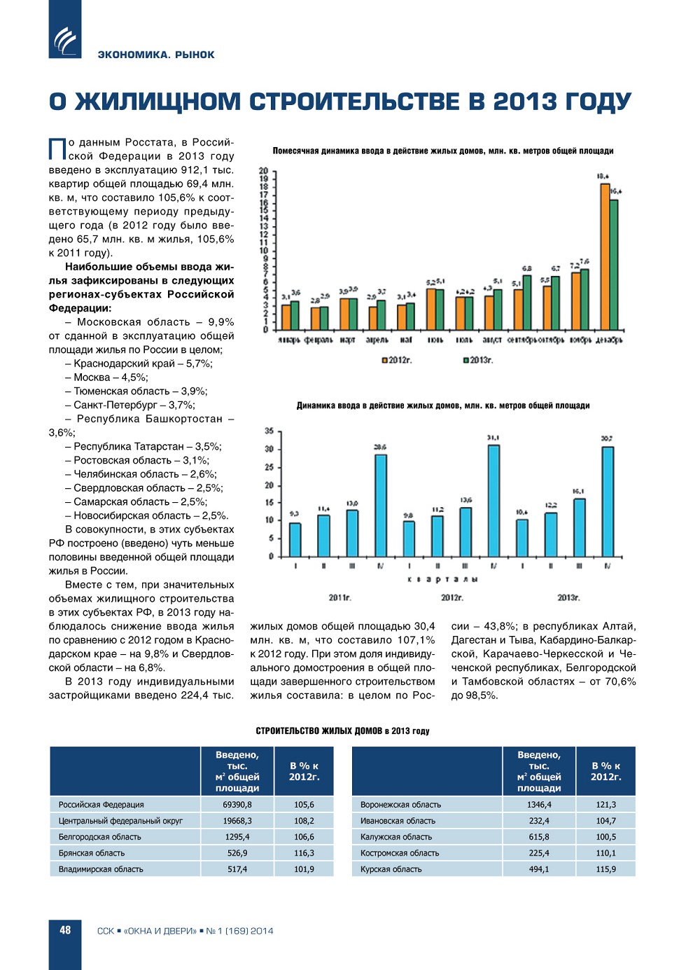 По данным Росстата, в Российской Федерации в 2013 году введено в эксплуатацию 912,1 тыс. квартир общей площадью 69,4 млн. кв. м, что составило 105,6% к соответствующему периоду предыдущего года (в 2012 году было введено 65,7 млн. кв. м жилья, 105,6% к... |