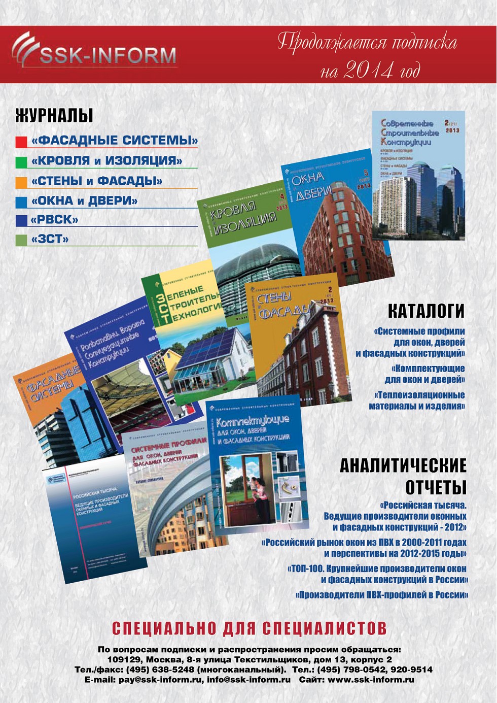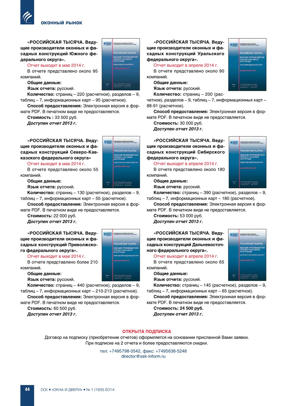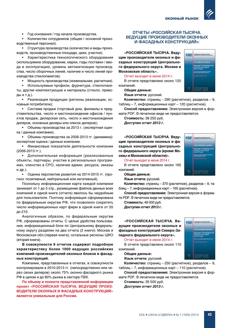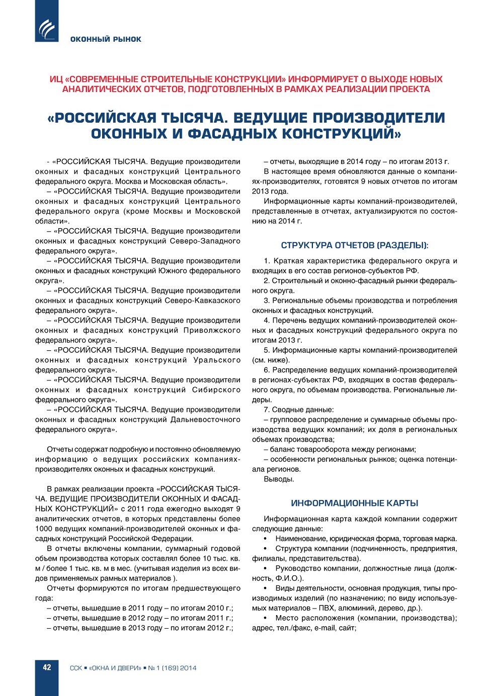 | ИЦ «ССК» информирует о выходе новых аналитических отчетов, подготовленных в рамках реализации проекта «РОССИЙСКАЯ ТЫСЯЧА. Ведущие производители оконных и фасадных конструкций» (анонс) | ...42 |