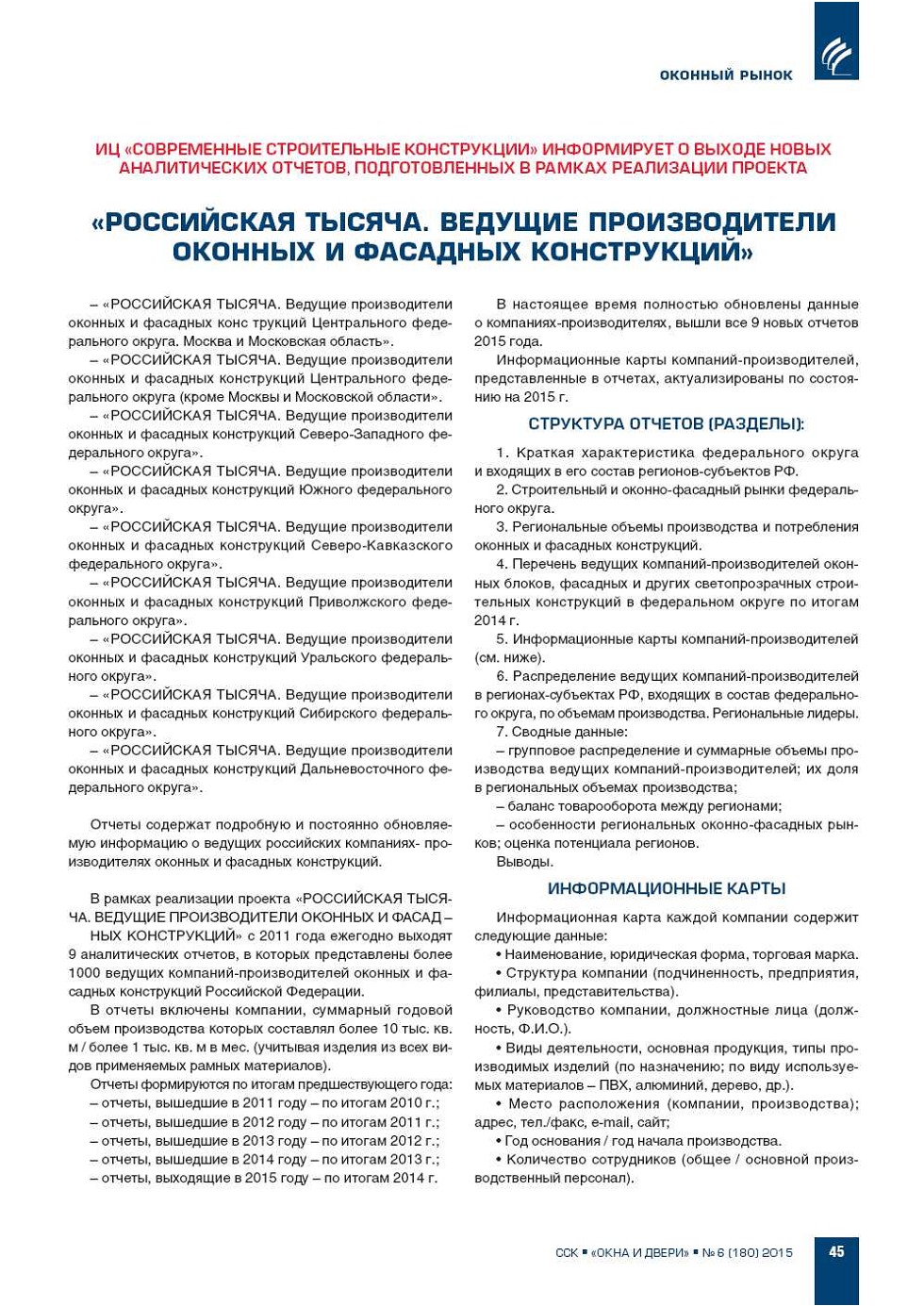 | Новые аналитические отчеты «Российская тысяча. Ведущие производители оконных и фасадных конструкций» | ...45 |