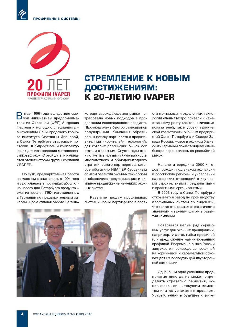 В мае 1996 года вследствие смелой инициативы предпринимателя из Саксонии (ФРГ) Андреаса Пертеля и молодого специалиста – выпускницы Ленинградского горного института Светланы Ивановой, в СанктПетербурге стартовали поставки ПВХпрофилей и комплектующих для... |