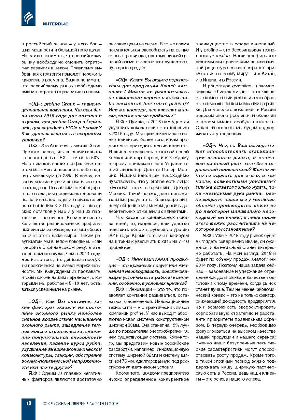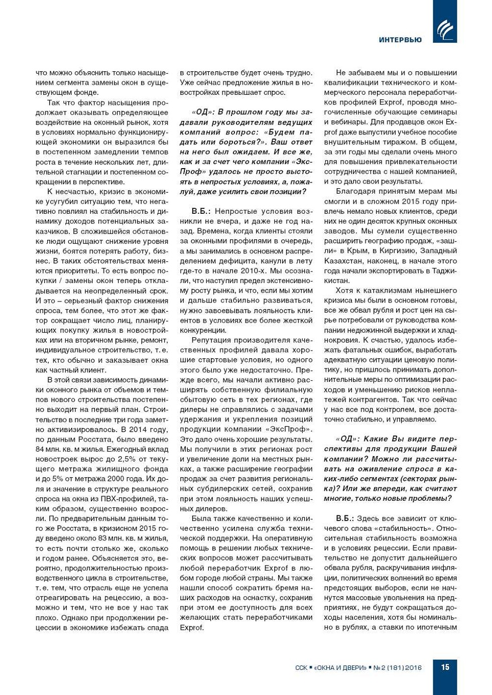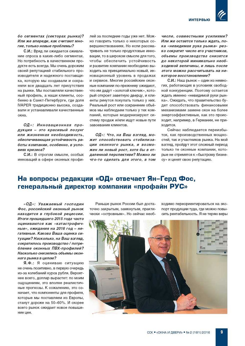 «ОД»: Уважаемый господин Фос, российский оконный рынок находится в глубокой рецессии. Итоги прошедшего 2015 года часто оцениваются как «катастрофичные», ожидания на 2016 год – негативные. Какова Ваша оценка ситуации? Насколько, на Ваш взгляд, сократилось... |