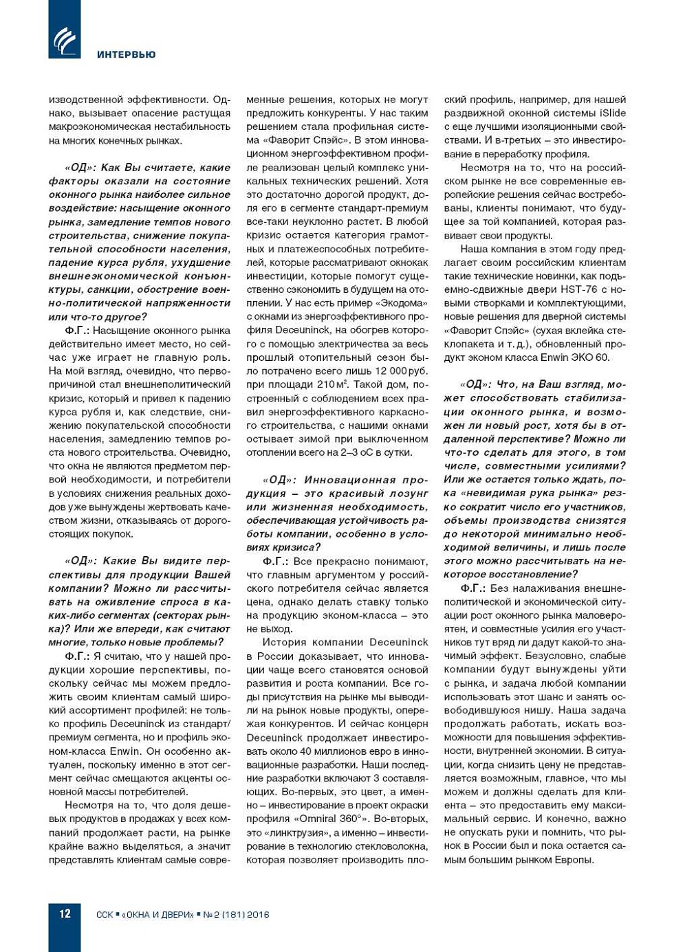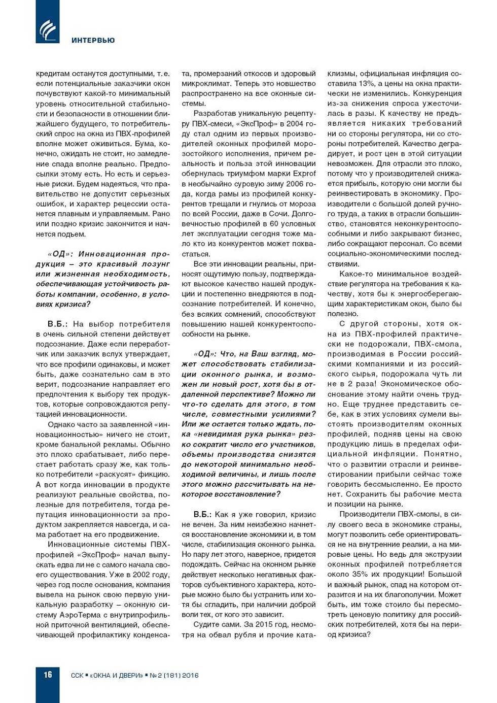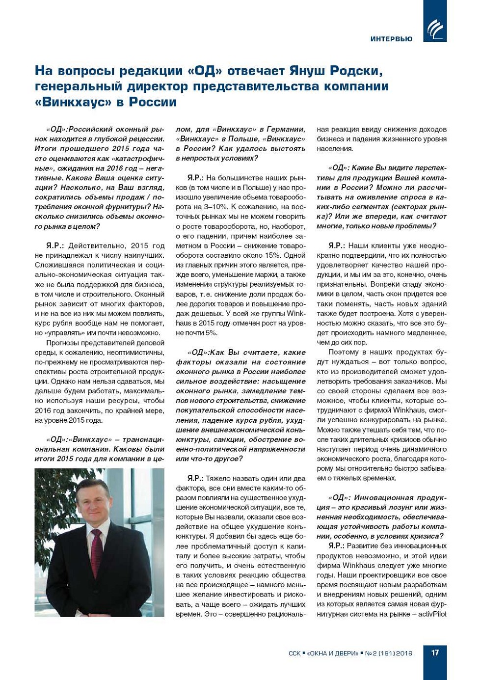 «ОД»: Уважаемый господин Фос, российский оконный рынок находится в глубокой рецессии. Итоги прошедшего 2015 года часто оцениваются как «катастрофичные», ожидания на 2016 год – негативные. Какова Ваша оценка ситуации? Насколько, на Ваш взгляд, сократилось... |