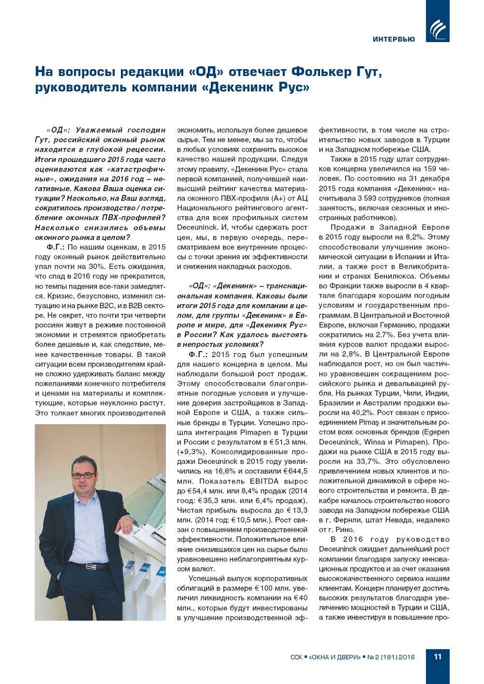«ОД»: Уважаемый господин Гут, российский оконный рынок находится в глубокой рецессии. Итоги прошедшего 2015 года часто оцениваются как «катастрофичные», ожидания на 2016 год – негативные. Какова Ваша оценка ситуации? Насколько, на Ваш взгляд, сократилось... |
