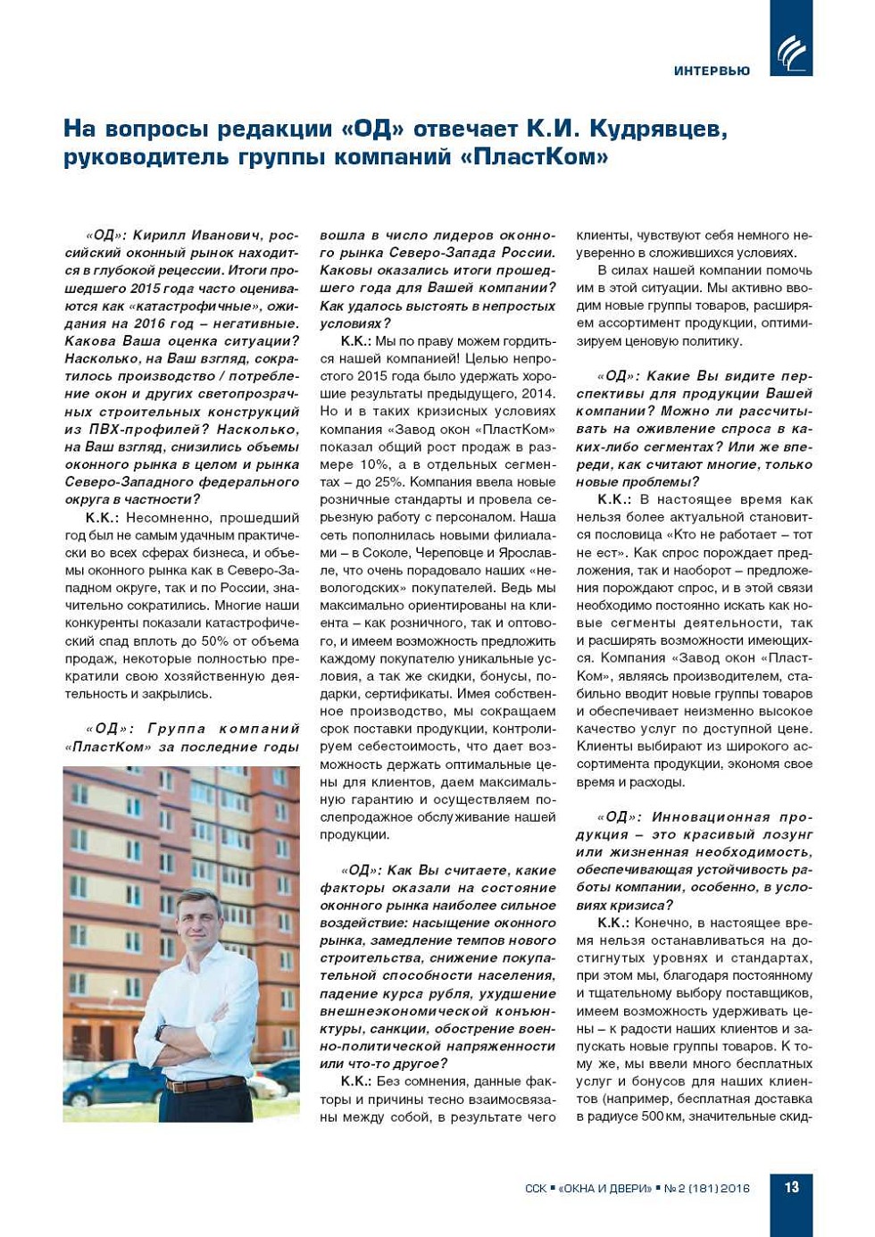 «ОД»: Кирилл Иванович, российский оконный рынок находится в глубокой рецессии. Итоги прошедшего 2015 года часто оцениваются как «катастрофичные», ожидания на 2016 год – негативные. Какова Ваша оценка ситуации? Насколько, на Ваш взгляд, сократилось производство... |