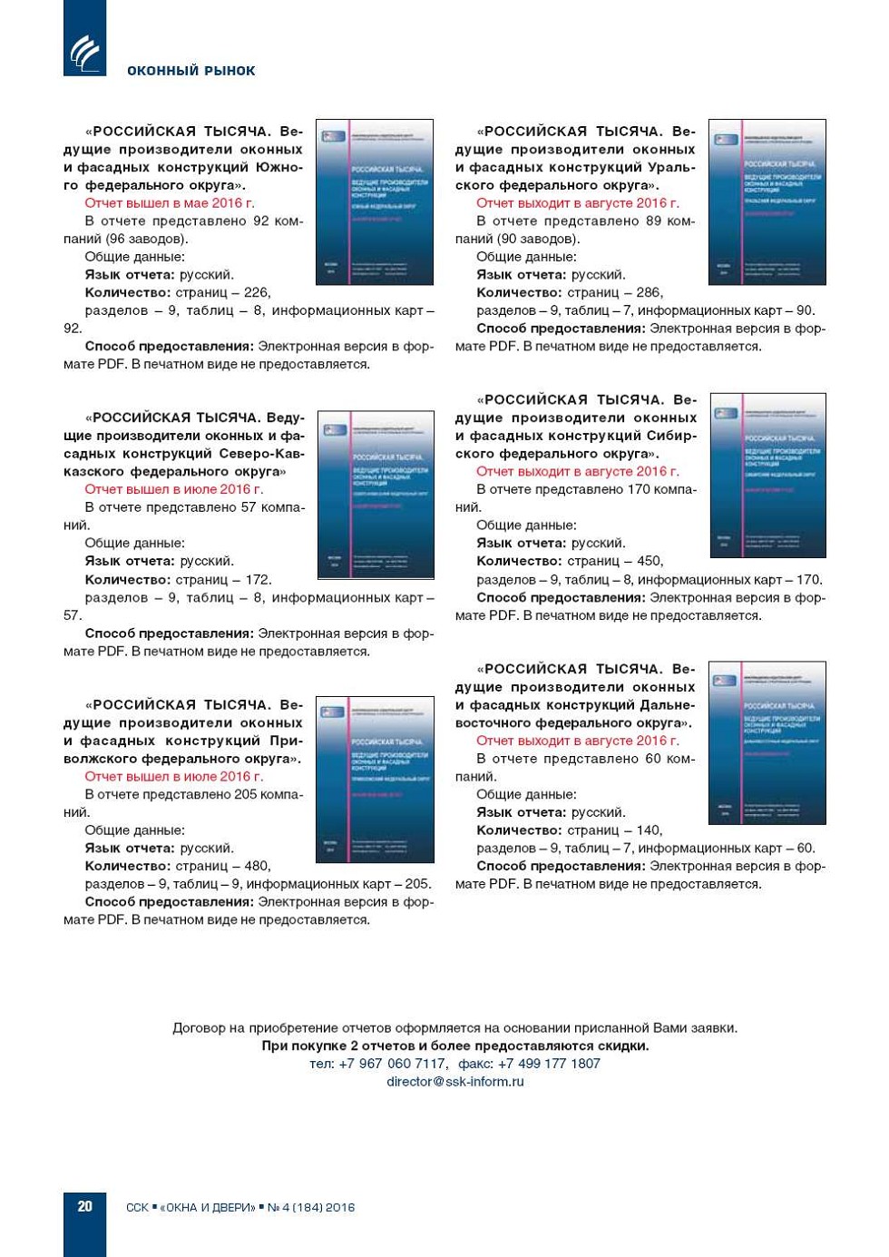 с 2011 года ежегодно выходят 9 аналитических отчетов, в которых представлены более 1000 ведущих компанийпроизводителей оконных и фасадных конструкций Российской Федерации. В отчеты включены компании, суммарный годовой объем производства которых составлял... |