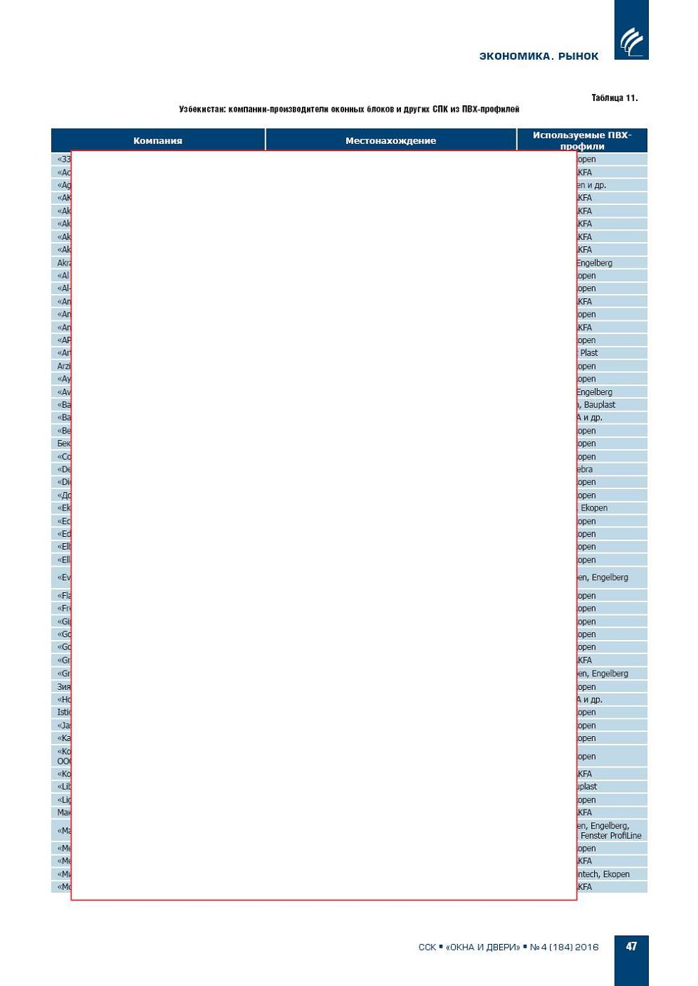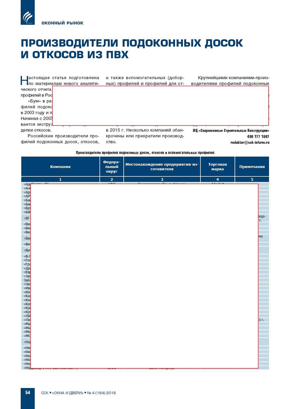 В отчете представлено около 300 компанийпроизводителей экструдированных ПВХпрофилей, в т.ч. более 50 производителей системных профилей для окон и дверей. |