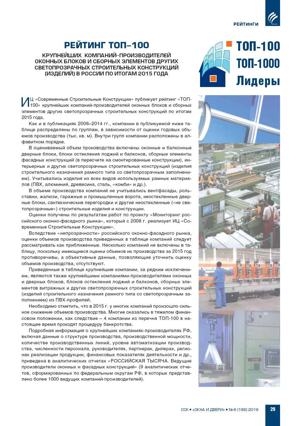 ИЦ «Современные Строительные Конструкции» публикует рейтинг «ТОП100» крупнейших компанийпроизводителей оконных блоков и сборных элементов других светопрозрачных строительных конструкций по итогам 2015 года. |