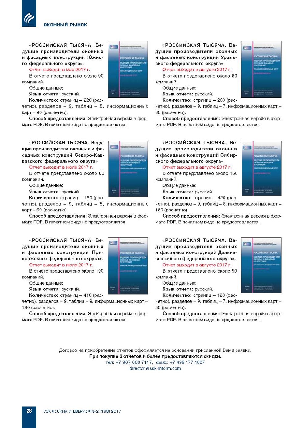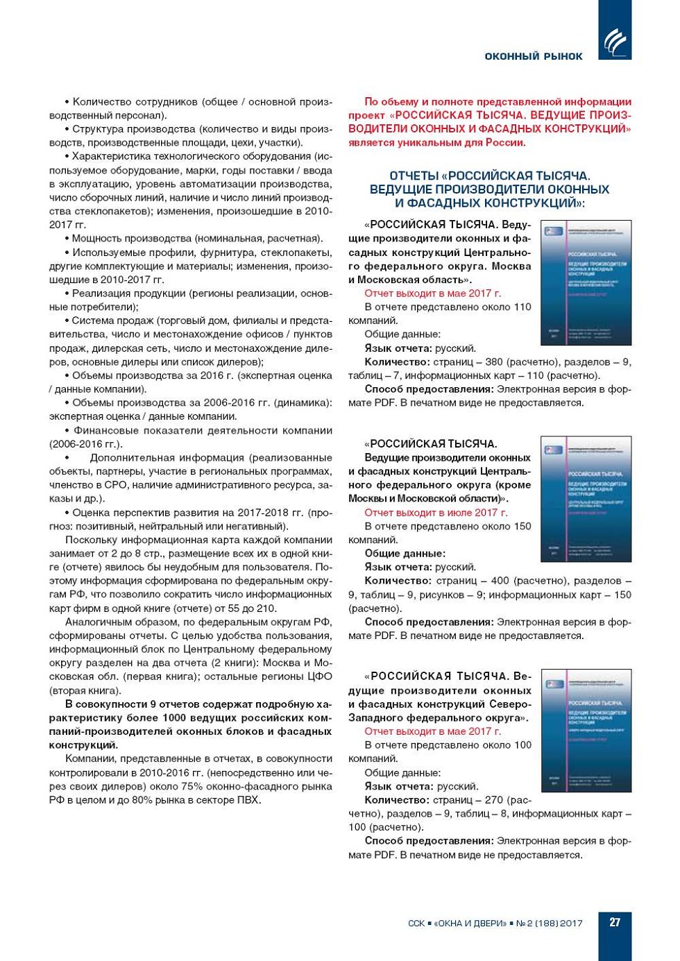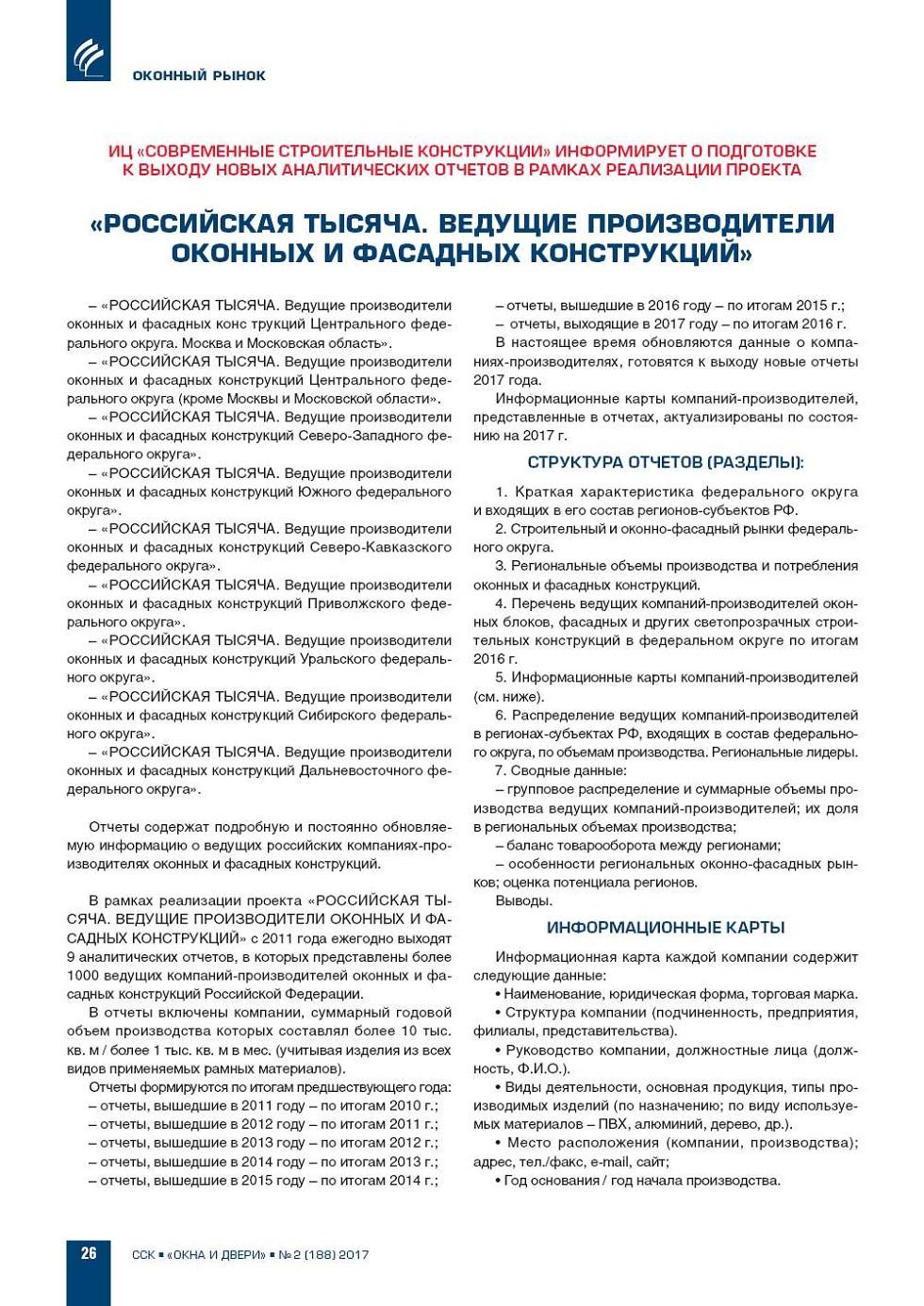 Отчеты содержат подробную и постоянно обновляе мую информацию о ведущих российских компанияхпро изводителях оконных и фасадных конструкций. В рамках реализации проекта «РОССИЙСКАЯ ТЫ СЯЧА. ВЕДУЩИЕ ПРОИЗВОДИТЕЛИ ОКОННЫХ И ФА САДНЫХ КОНСТРУКЦИЙ» с 2011... |