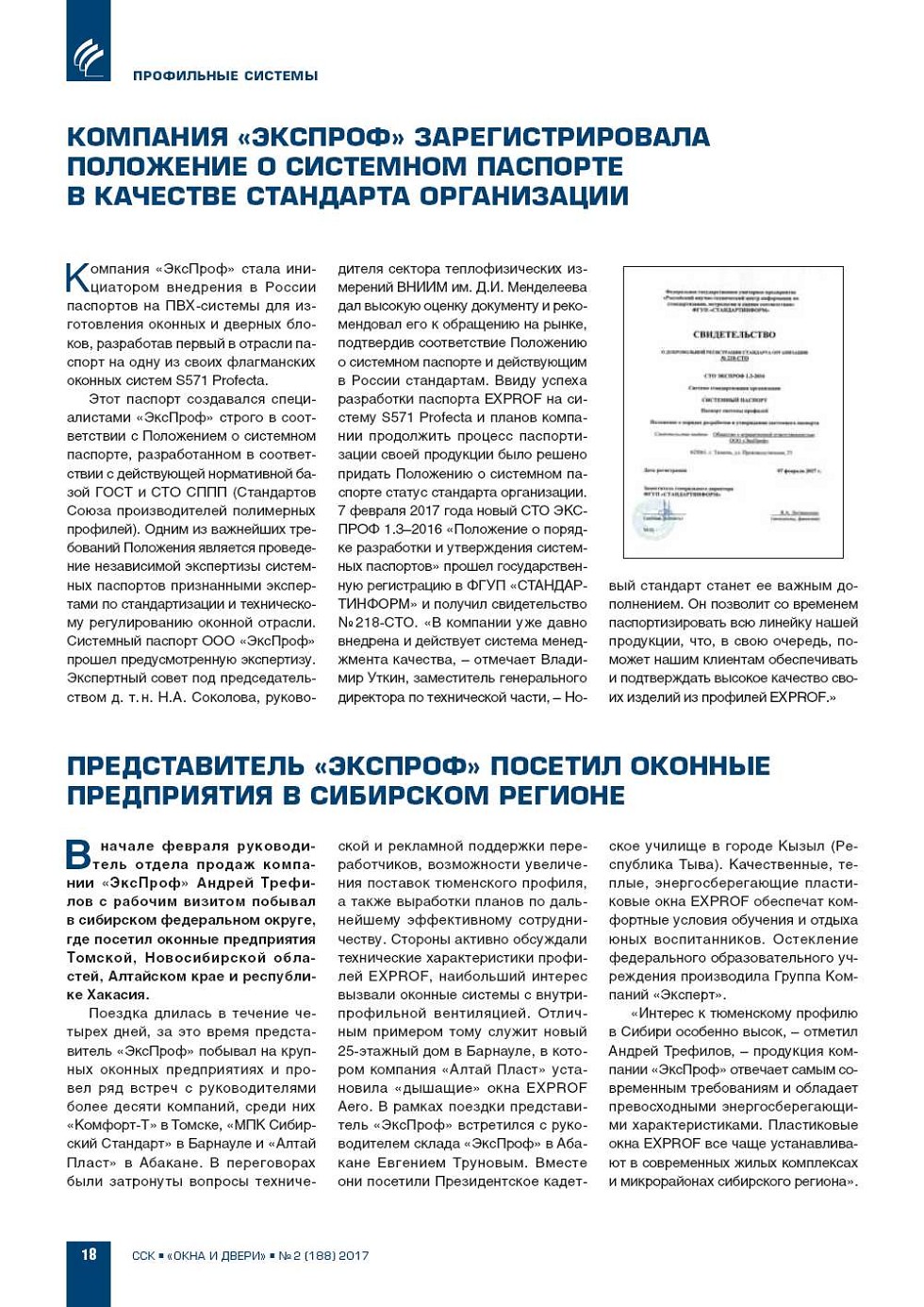 Компания «ЭксПроф» стала инициатором внедрения в России паспортов на ПВХсистемы для изготовления оконных и дверных блоков, разработав первый в отрасли паспорт на одну из своих флагманских оконных систем S571 Profecta. |