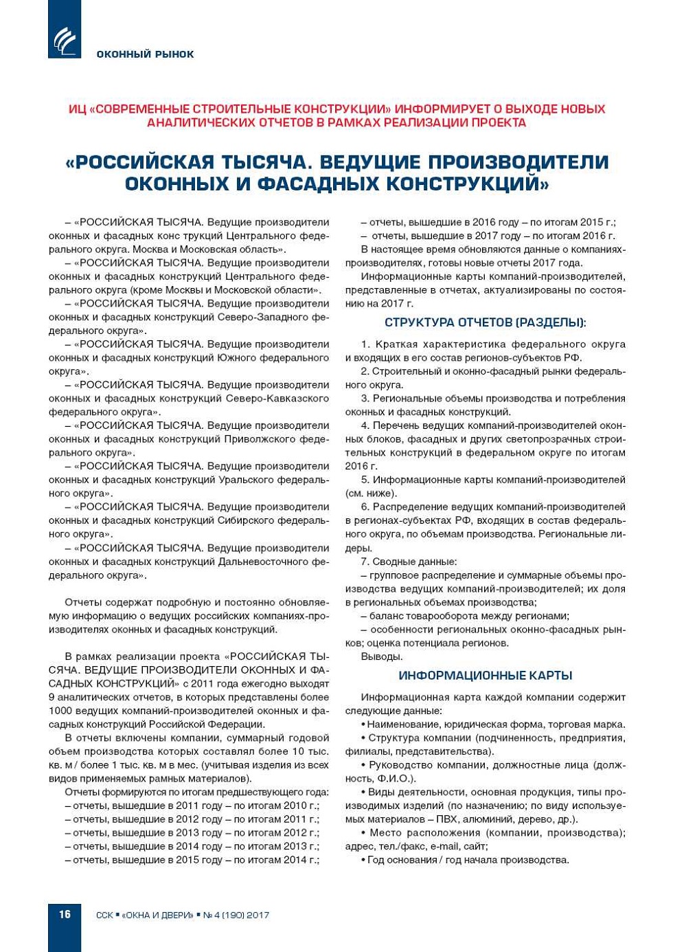 Отчет подготовлен ИЦ «Современные Строительные Конструкции» по результатам работ, выполненных в 20082017 гг. в рамках реализации проекта «Мониторинг российского рынка строительных материалов и изделий». |