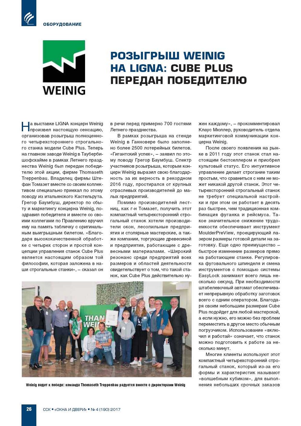 На выставке LIGNA концерн Weinig произвел настоящую сенсацию, организовав розыгрыш полноценного четырехстороннего строгального станка модели Cube Plus. |