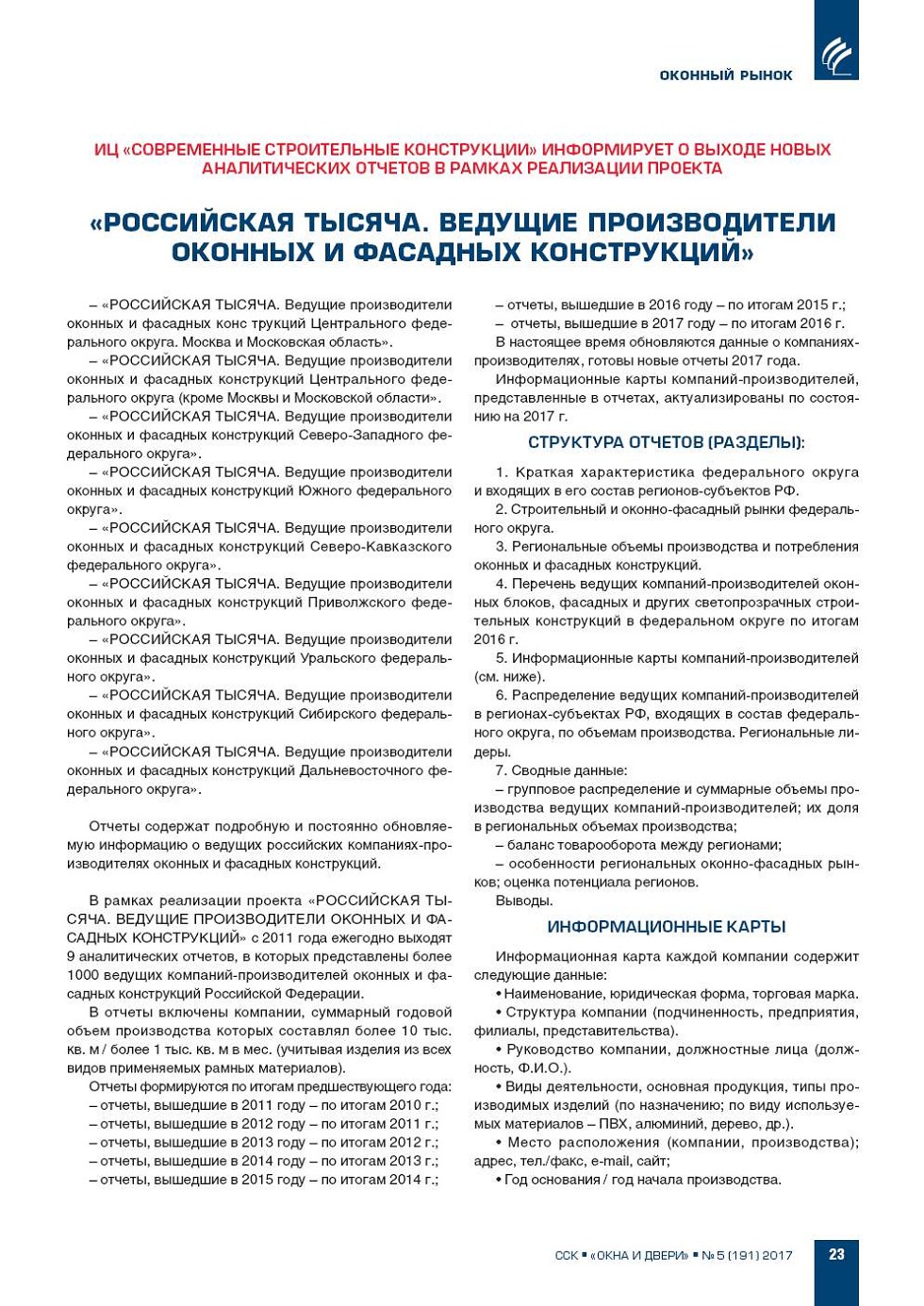 ИЦ «СОВРЕМЕННЫЕ СТРОИТЕЛЬНЫЕ КОНСТРУКЦИИ» ИНФОРМИРУЕТ О ВЫХОДЕ НОВЫХ АНАЛИТИЧЕСКИХ ОТЧЕТОВ В РАМКАХ РЕАЛИЗАЦИИ ПРОЕКТА «РОССИЙСКАЯ ТЫСЯЧА. ВЕДУЩИЕ ПРОИЗВОДИТЕЛИ ОКОННЫХ И ФАСАДНЫХ КОНСТРУКЦИЙ» |