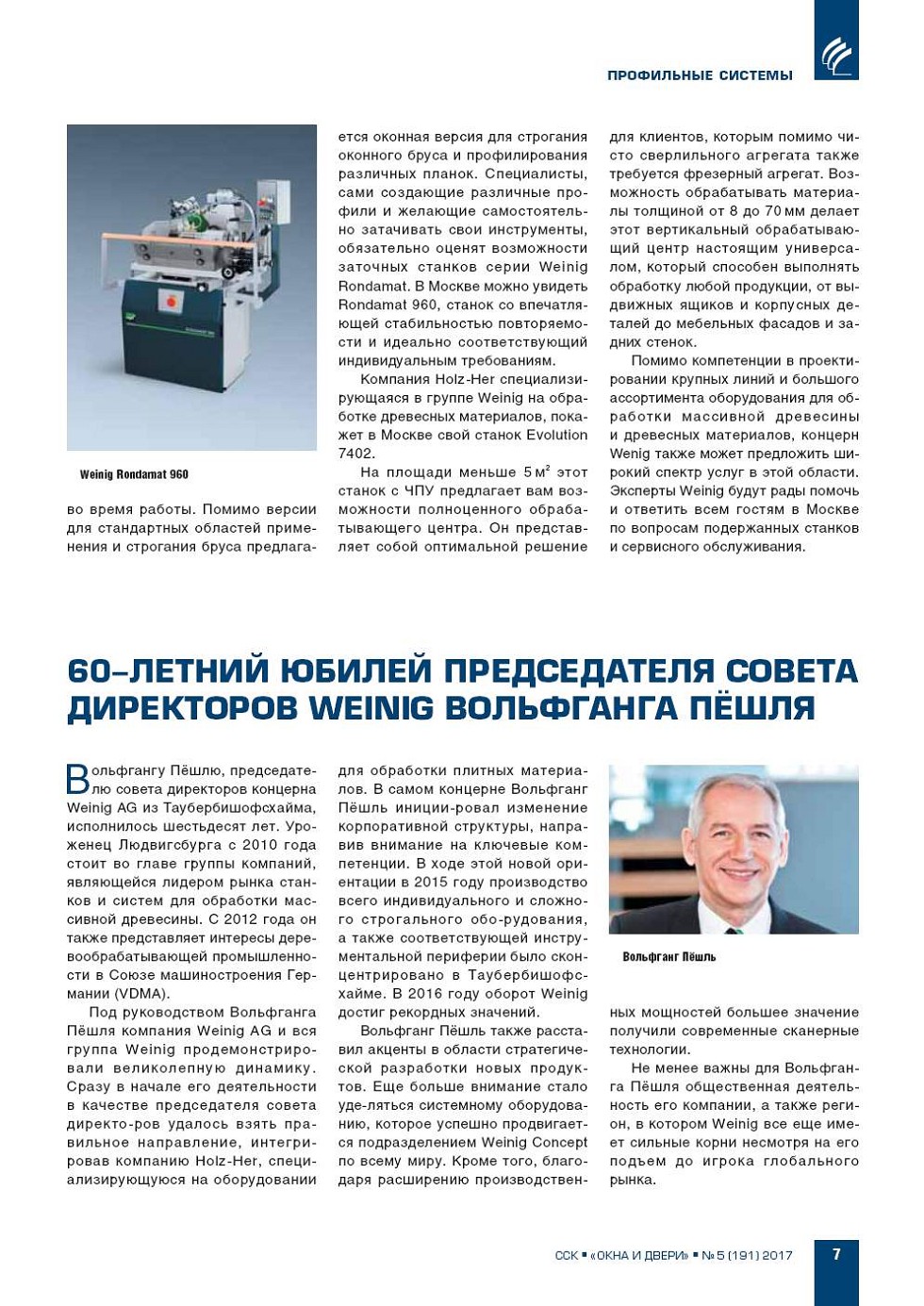 Вольфгангу Пёшлю, председателю совета директоров концерна Weinig AG из Таубербишофсхайма, исполнилось шестьдесят лет. Уроженец Людвигсбурга с 2010 года стоит во главе группы компаний, являющейся лидером рынка станков и систем для обработки массивной древесины. |