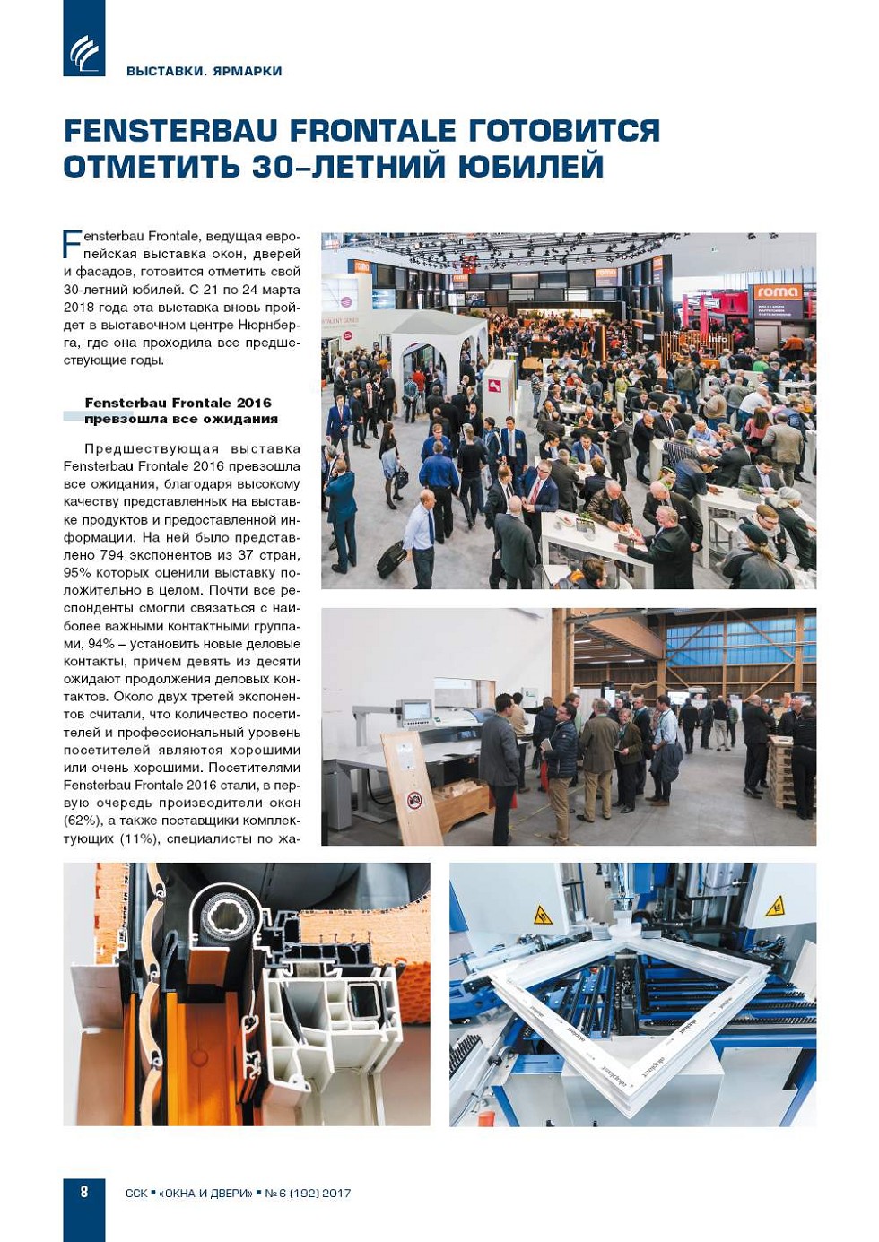 Fensterbau Frontale, ведущая европейская выставка окон, дверей и фасадов, готовится отметить свой 30летний юбилей. С 21 по 24 марта 2018 года эта выставка вновь пройдет в выставочном центре Нюрнберга, где она проходила все предшествующие годы. |