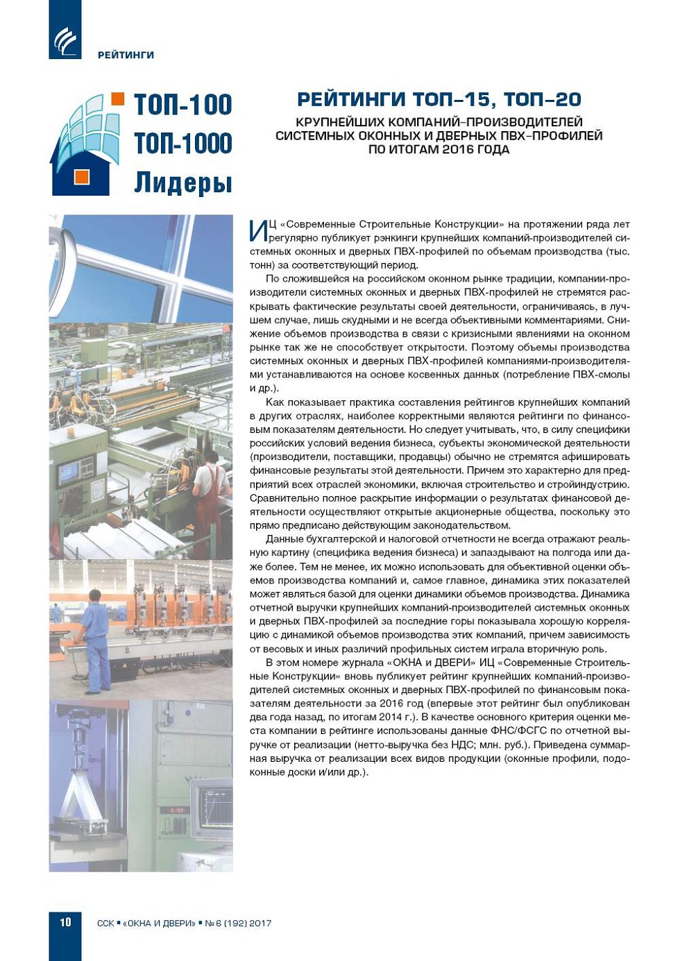 ИЦ «Современные Строительные Конструкции» на протяжении ряда лет регулярно публикует рэнкинги крупнейших компанийпроизводителей системных оконных и дверных ПВХпрофилей по объемам производства (тыс. тонн) за соответствующий период. |