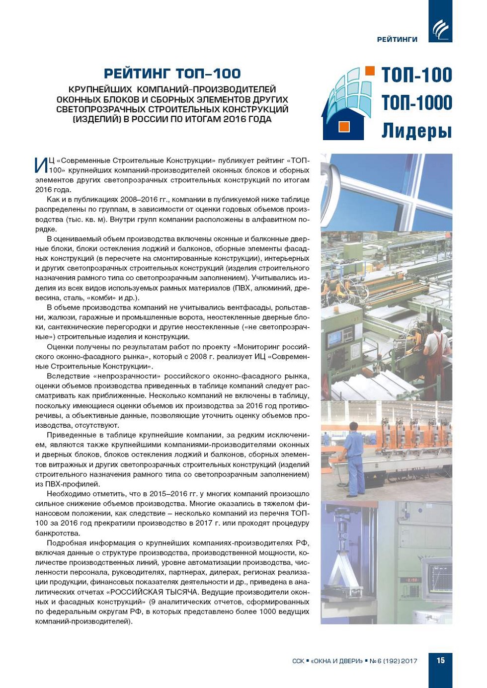 ИЦ «Современные Строительные Конструкции» публикует рейтинг «ТОП100» крупнейших компанийпроизводителей оконных блоков и сборных элементов других светопрозрачных строительных конструкций по итогам 2016 года. Как и в публикациях 2008–2016 гг., компании... |