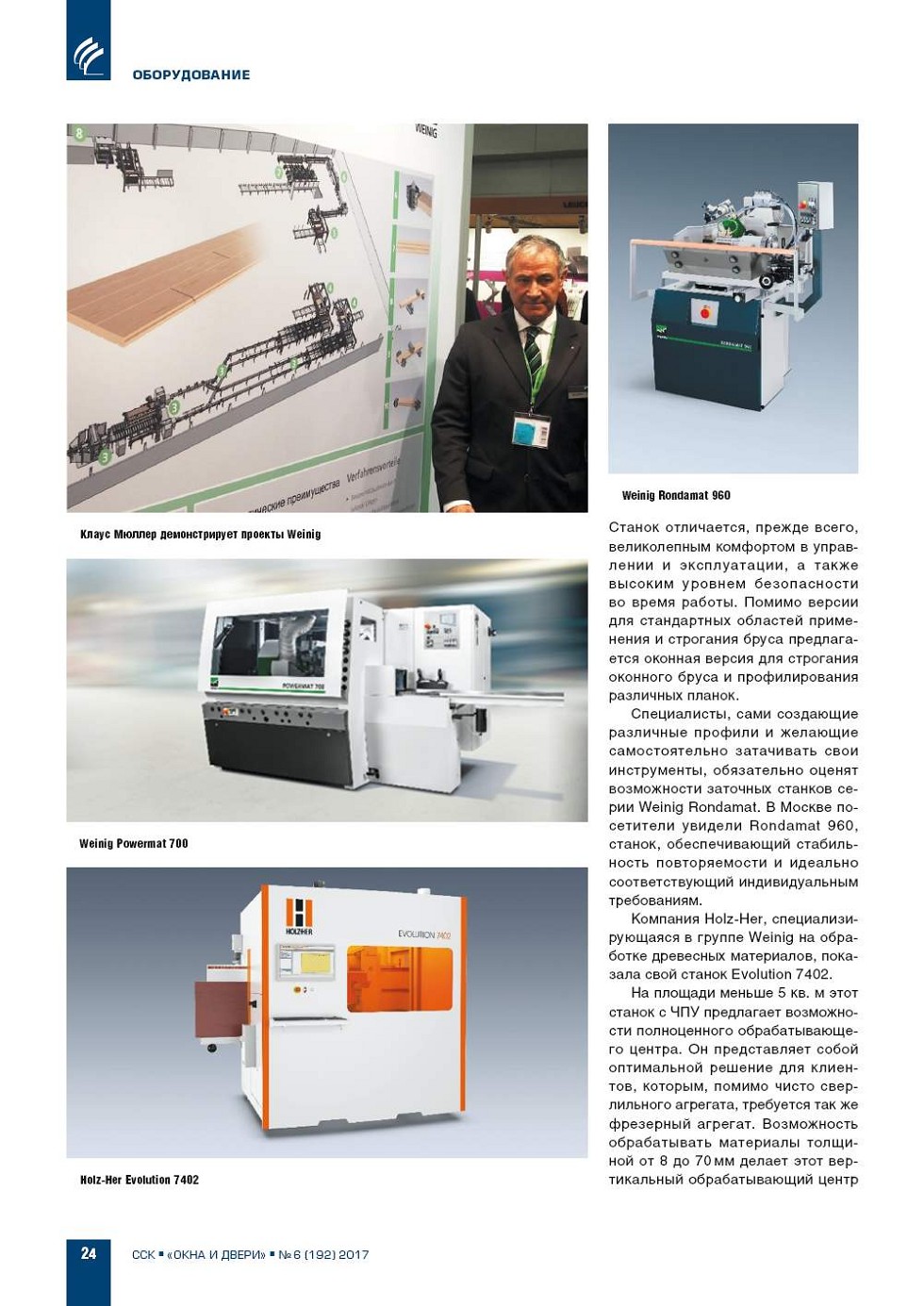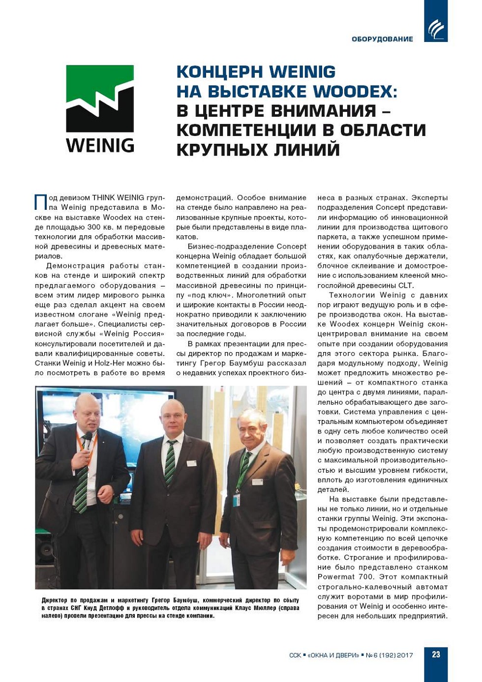 Под девизом THINK WEINIG группа Weinig представила в Москве на выставке Woodex на стенде площадью 300 кв. м передовые технологии для обработки массивной древесины и древесных материалов. |