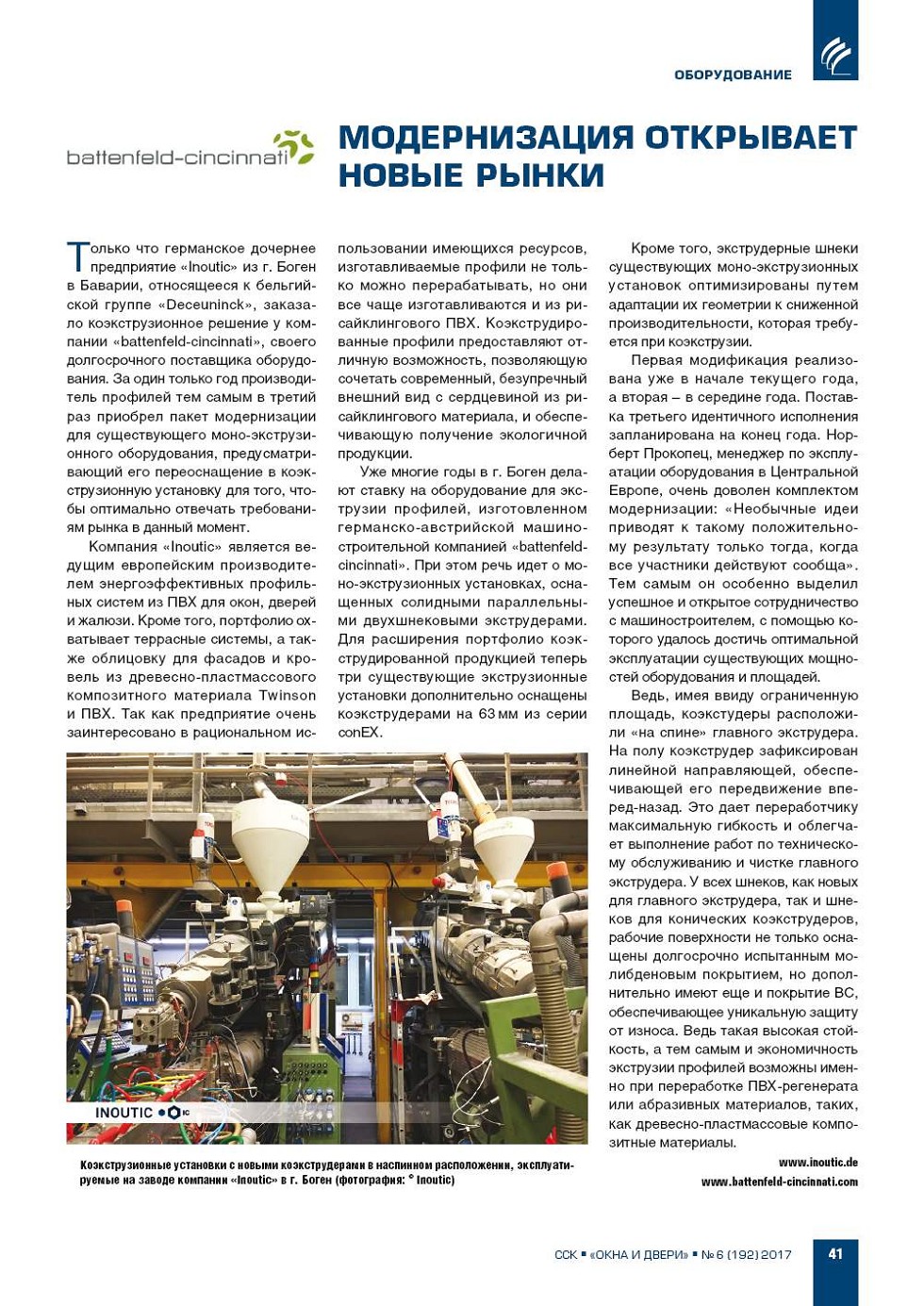 Только что германское дочернее предприятие «Inoutic» из г. Боген в Баварии, относящееся к бельгийской группе «Deceuninck», заказало коэкструзионное решение у компании «battenfeldcincinnati», своего долгосрочного поставщика оборудования. За один только... |