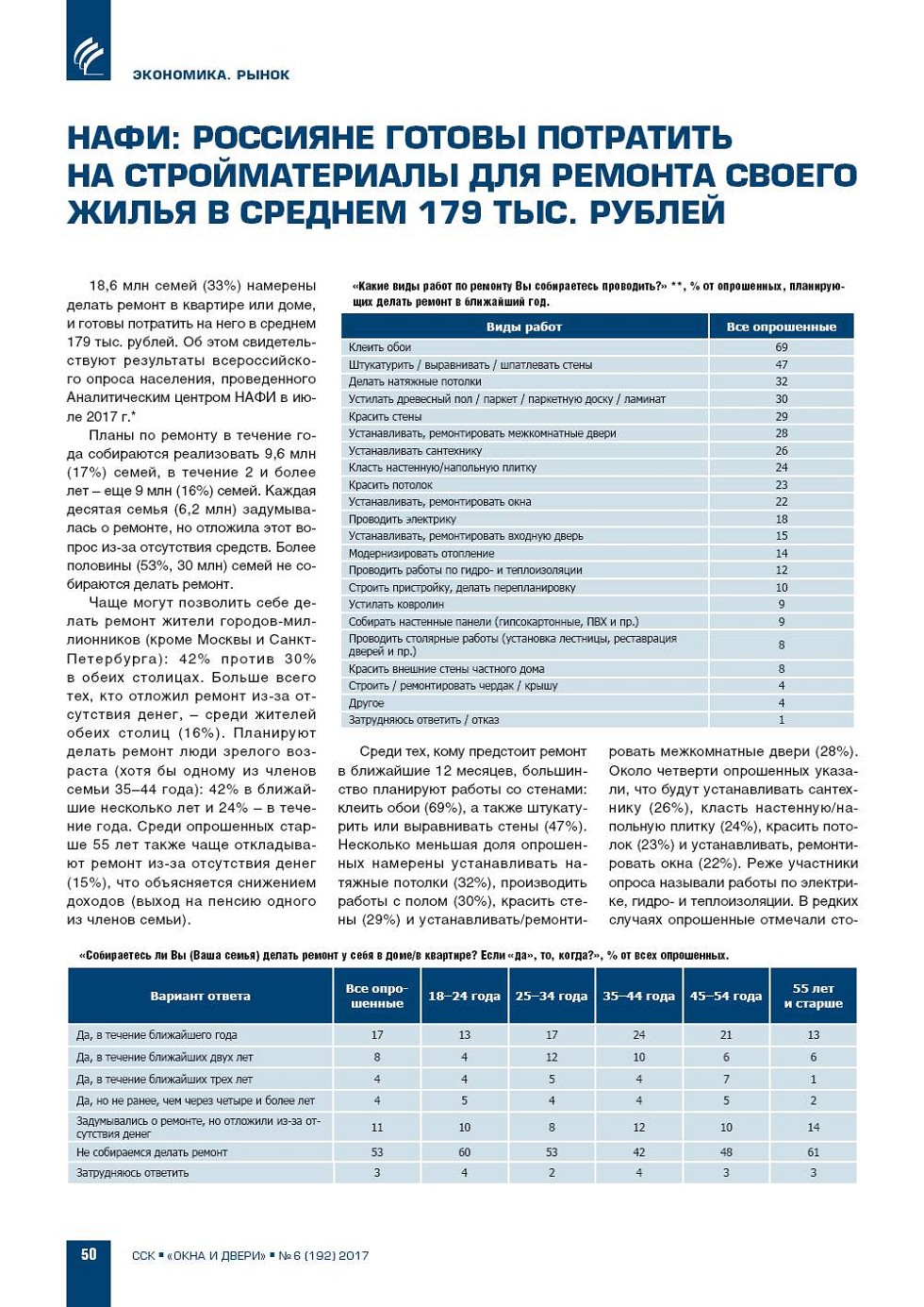 18,6 млн семей (33%) намерены делать ремонт в квартире или доме, и готовы потратить на него в среднем 179 тыс. рублей. Об этом свидетельствуют результаты всероссийского опроса населения, проведенного Аналитическим центром НАФИ в июле 2017 г.* |