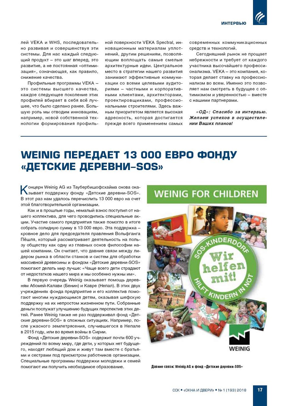 Концерн Weinig AG из Таубербишофсхайма снова оказывает поддержку фонду «Детские деревниSOS». В этот раз нам удалось перечислить 13 000 евро на счет этой благотворительной организации. |