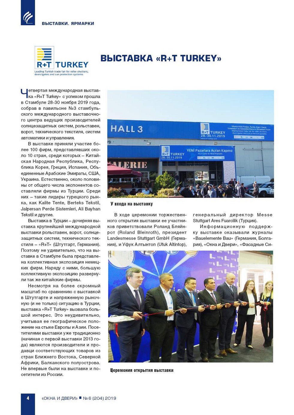 Четвертая международная выставка «R+T Turkey» с успехом прошла в Стамбуле 2830 ноября 2019 года, собрав в павильоне №3 стамбульского международного выставочного центра ведущих производителей солнцезащитных систем, рольставен, ворот, технического текстиля... |