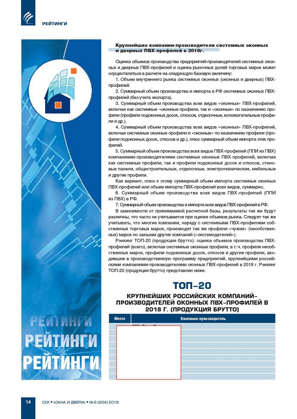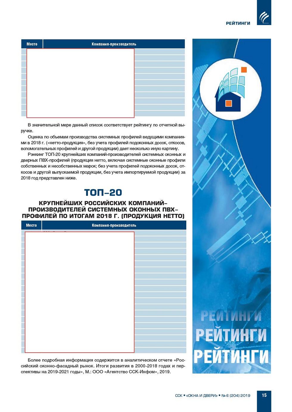 Рейтинги ТОП-15, ТОП-20 крупнейших компаний-производителей системных оконных и дверных ПВХ-профилей по итогам 2018 года