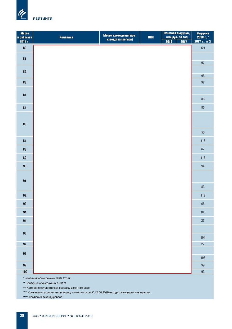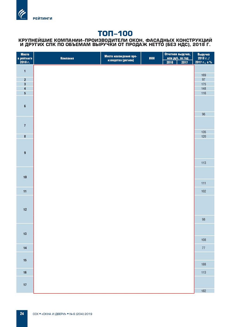 Рейтинг ТОП-100 крупнейших компаний-производителей оконных блоков и других светопрозрачных строительных конструкций (изделий) по финансовым показателям деятельности в 2018 году