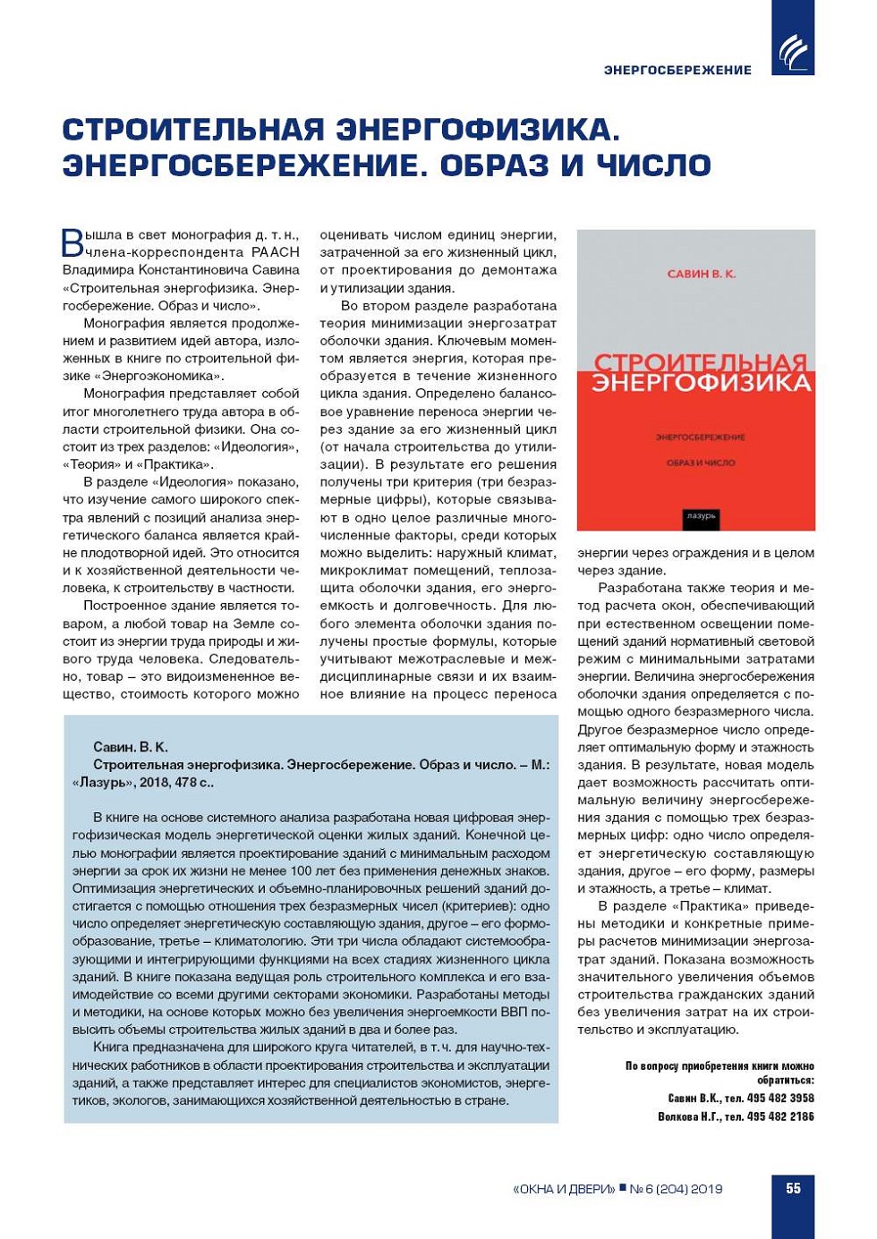 Вышла в свет монография д. т. н., членакорреспондента РААСН Владимира Константиновича Савина «Строительная энергофизика. Энергосбережение. Образ и число». |