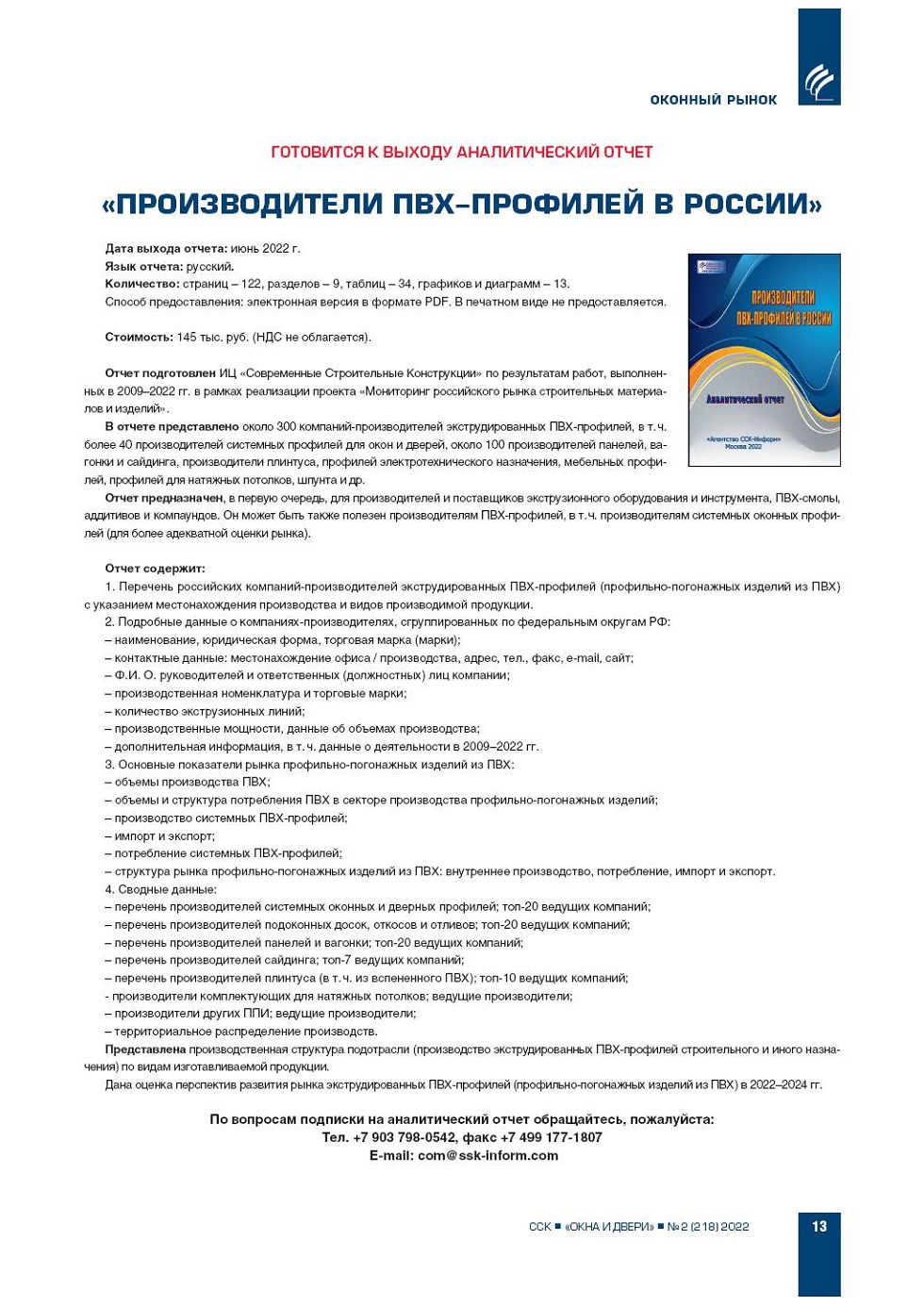Отчет подготовлен ИЦ «Современные Строительные Конструкции» по результатам работ, выполненных в 2009–2022 гг. в рамках реализации совместного проекта «Мониторинг российского строительного рынка». |