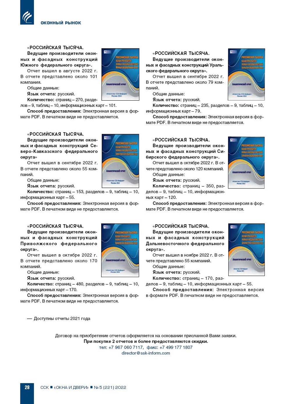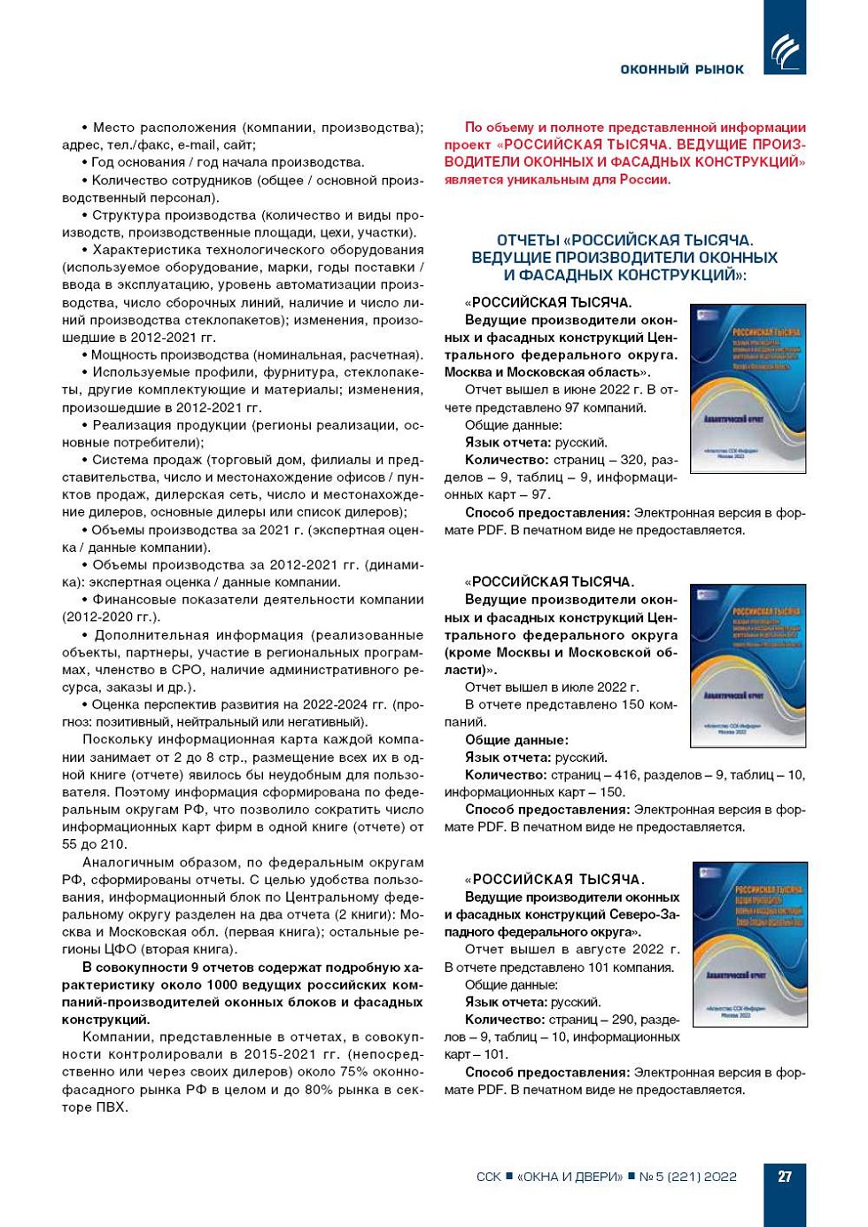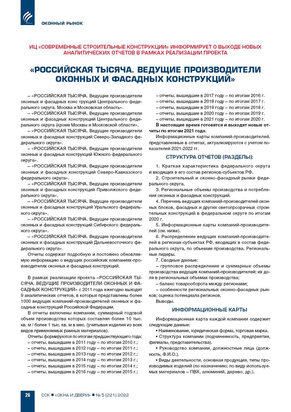 ИЦ «ССК» информирует о выходе новых аналитических отчетов «Российская тысяча. Ведущие производители оконных и фасадных конструкций» ...26