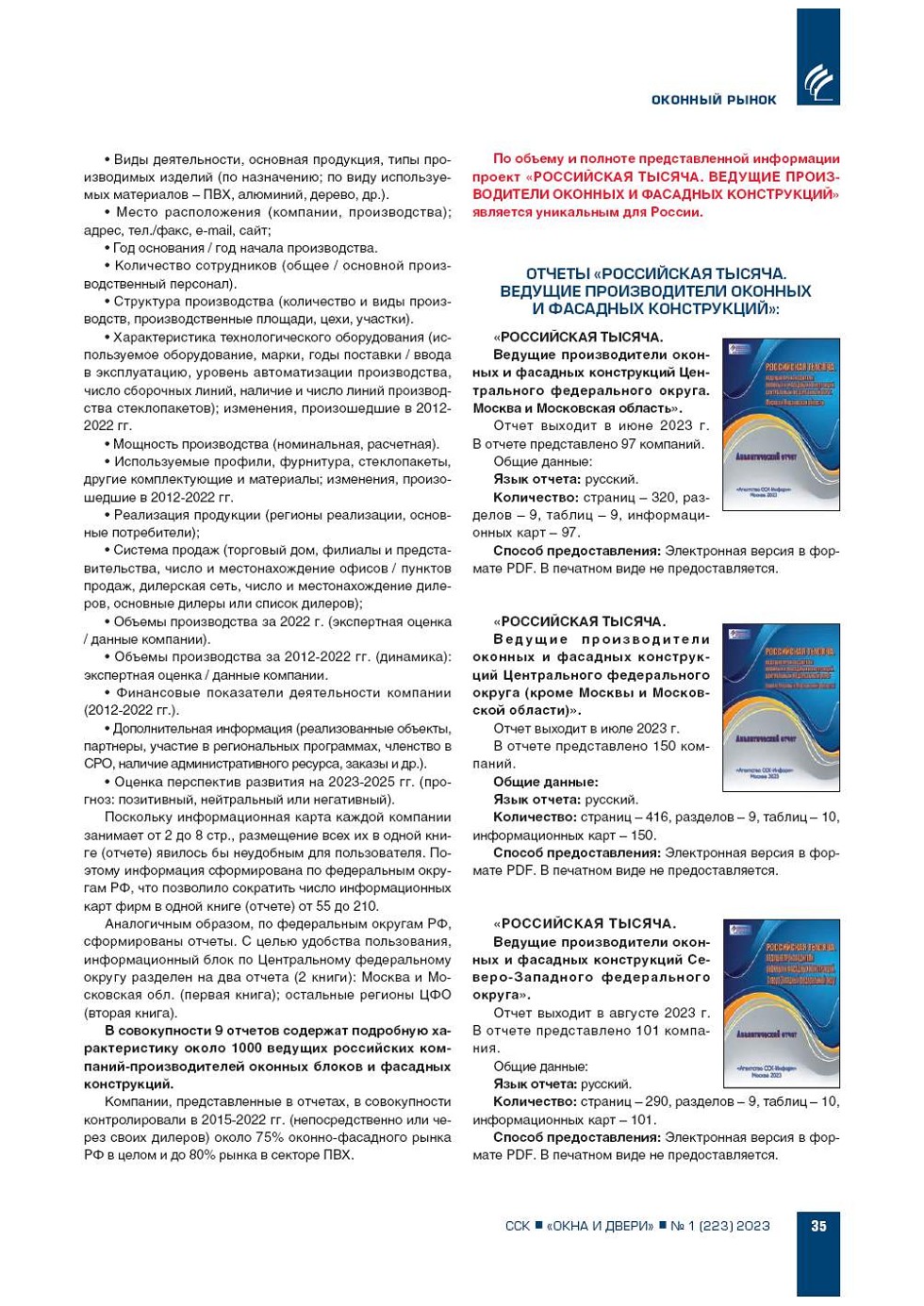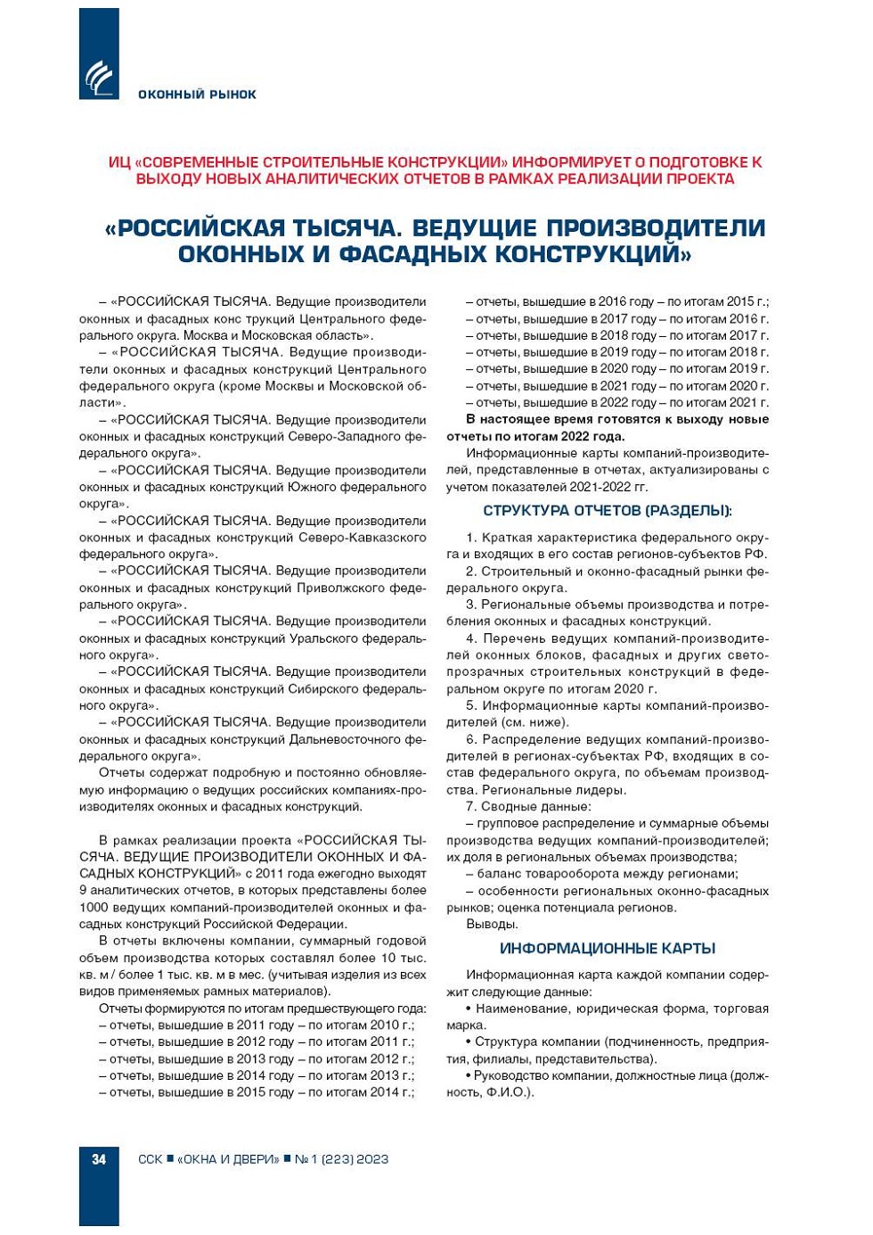 | ИЦ «ССК» информирует о подготовке к выходу новых аналитических отчетов «Российская тысяча. Ведущие производители оконных и фасадных конструкций» | ...34 |