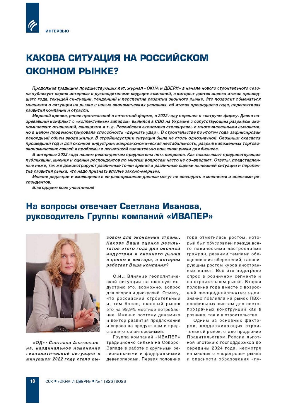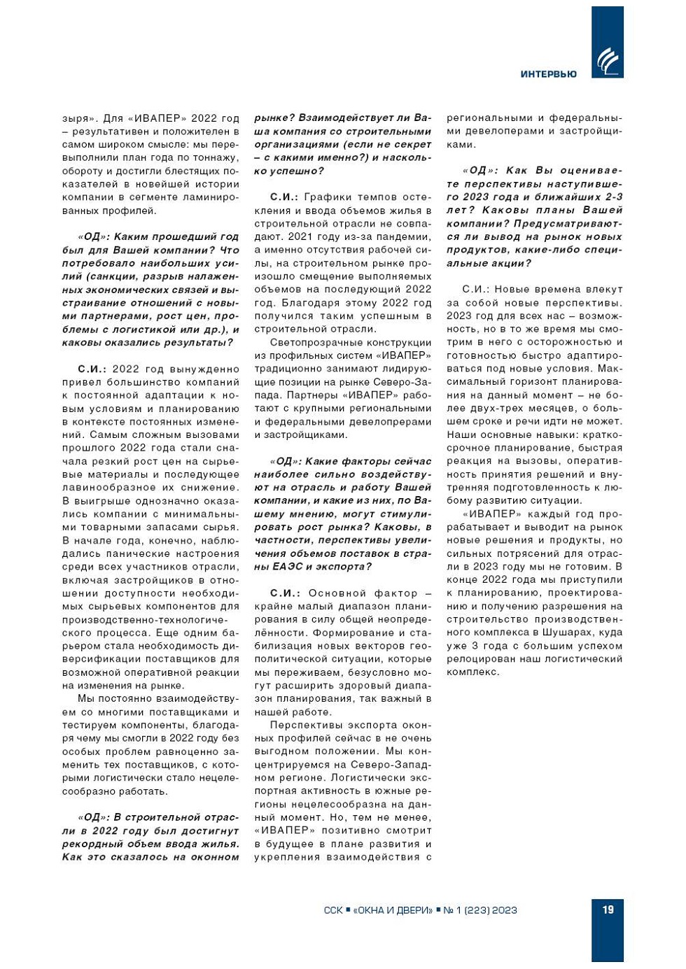 Продолжая традицию предшествующих лет, журнал «ОКНА и ДВЕРИ» в начале нового строительного сезона публикует серию интервью с руководителями ведущих компаний, в которых дается оценка итогов прошедшего года, текущей си¬туации, тенденций и перспектив развития... |